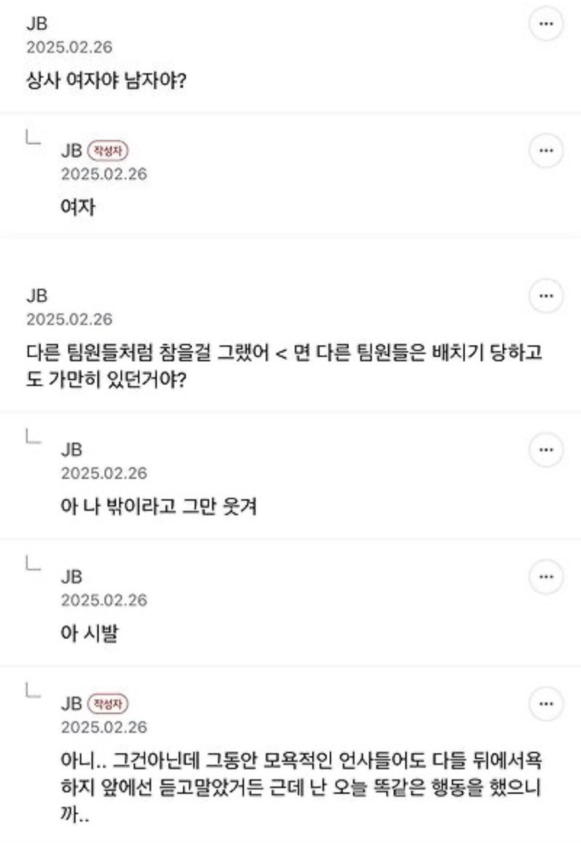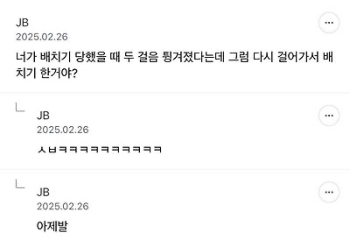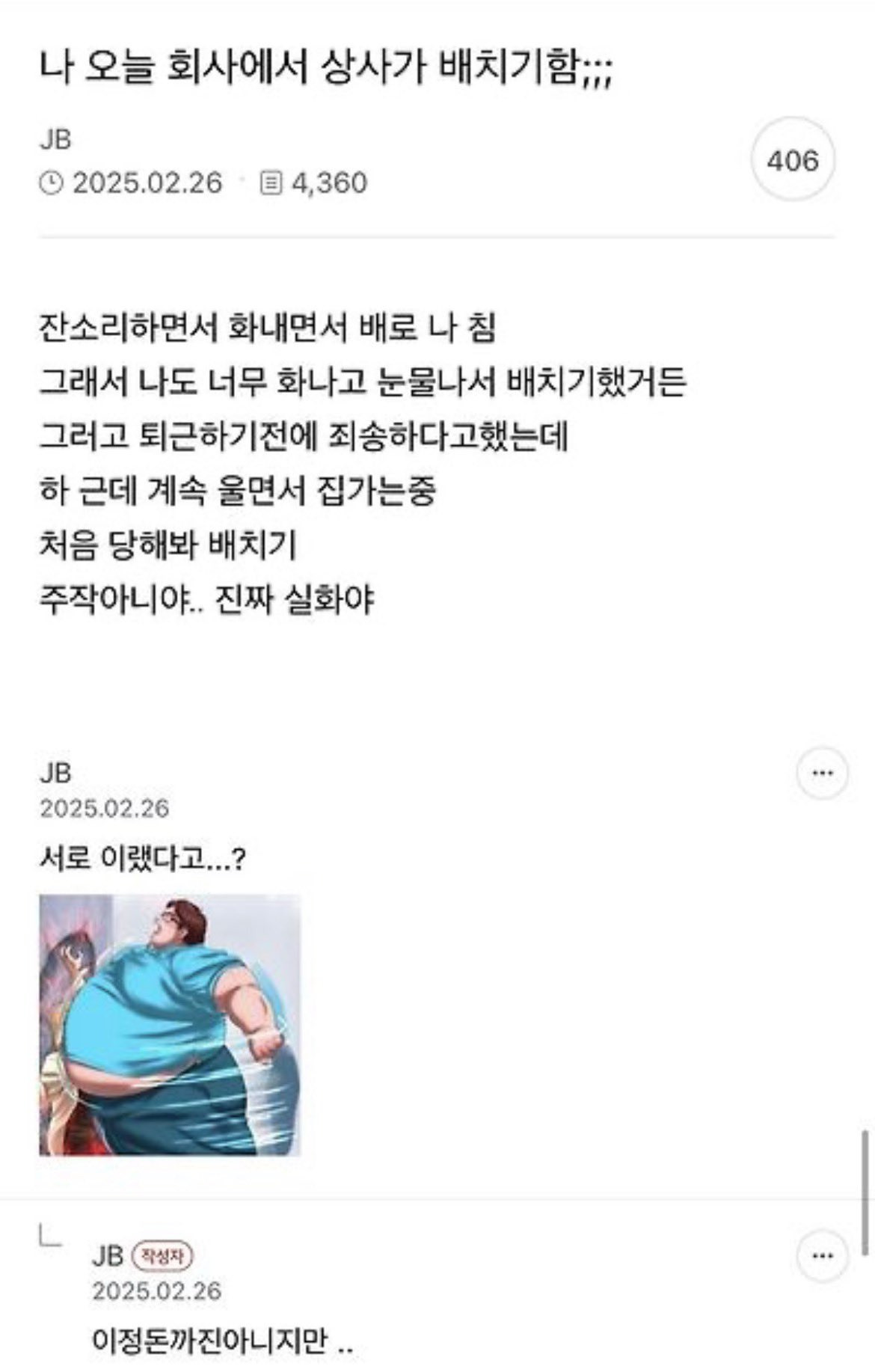 [기타]나 오늘 회사에서 상사가 배치기함;;;.jpg 작성자JB|작성시간26.03.27|조회수36,785 목록 댓글 4 글자크기 작게가 글자크기 크게가 다음검색 현재 게시글 추가 기능 열기 북마크 공유하기 신고 센터로 신고 댓글 댓글 4 댓글쓰기 답글쓰기 댓글 리스트 작성자JB | 작성시간 26.03.27 ㅋㅋㅋㅋ 작성자JB | 작성시간 26.03.27 아 ㅈㄴㅇㄱ ㅋㅋㅋㅋㅋㅋ 작성자JB | 작성시간 26.03.27 아ㅋㅋㅋㅋㅋㅋㅋㅋㅋ 작성자JB | 작성시간 26.04.15 new 마지막ㅋㅋㅋㅋㅋ 댓글 전체보기