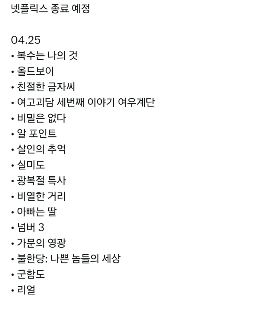 [기타]넷플릭스 종료예정 작성자JB|작성시간26.03.30|조회수317 목록 댓글 0 글자크기 작게가 글자크기 크게가 다음검색 현재 게시글 추가 기능 열기 북마크 공유하기 신고 센터로 신고 댓글 댓글 0 댓글쓰기 답글쓰기 댓글 리스트
