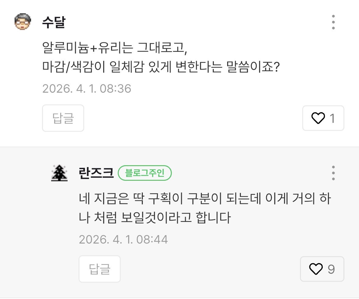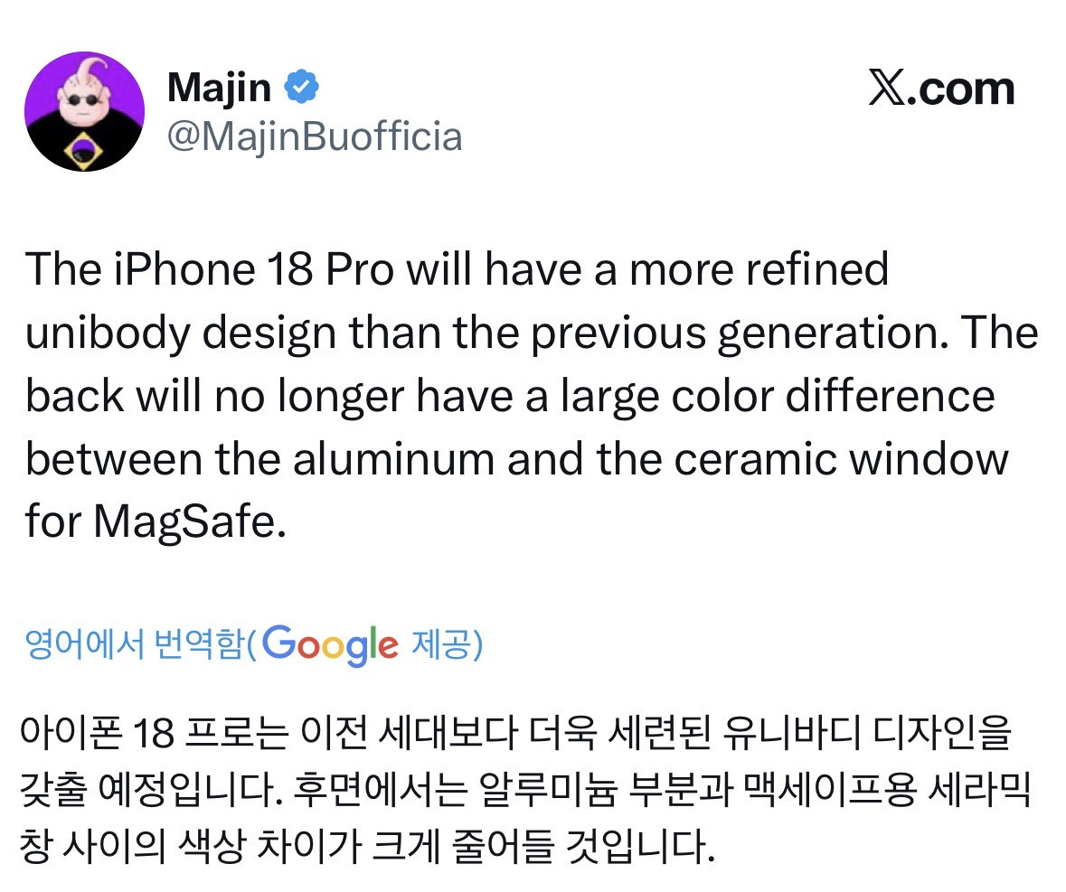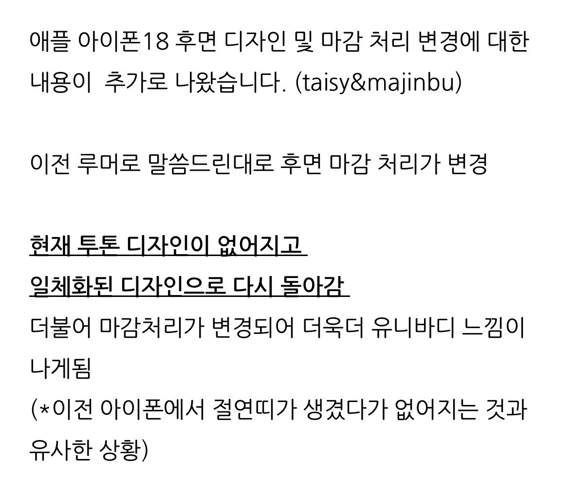 [기타](루머) 아이폰 프로 후면 투톤 디자인 1년만에 사라질 예정.jpg 작성자JB|작성시간26.04.01|조회수258 목록 댓글 2 글자크기 작게가 글자크기 크게가 (예시로 만든거)지금은 이런데 저 구역을 거의 하나처럼 보이게 바꾸려나봄색상은 아직 아무도 모름!!!ㅊㅊ ㄷㅋ 다음검색 현재 게시글 추가 기능 열기 북마크 공유하기 신고 센터로 신고 댓글 댓글 2 댓글쓰기 답글쓰기 댓글 리스트 작성자JB | 작성시간 26.04.01 색깔 궁금하다 작성자JB | 작성시간 26.04.02 사과 모양 좀 더 위로 올렸으면 댓글 전체보기