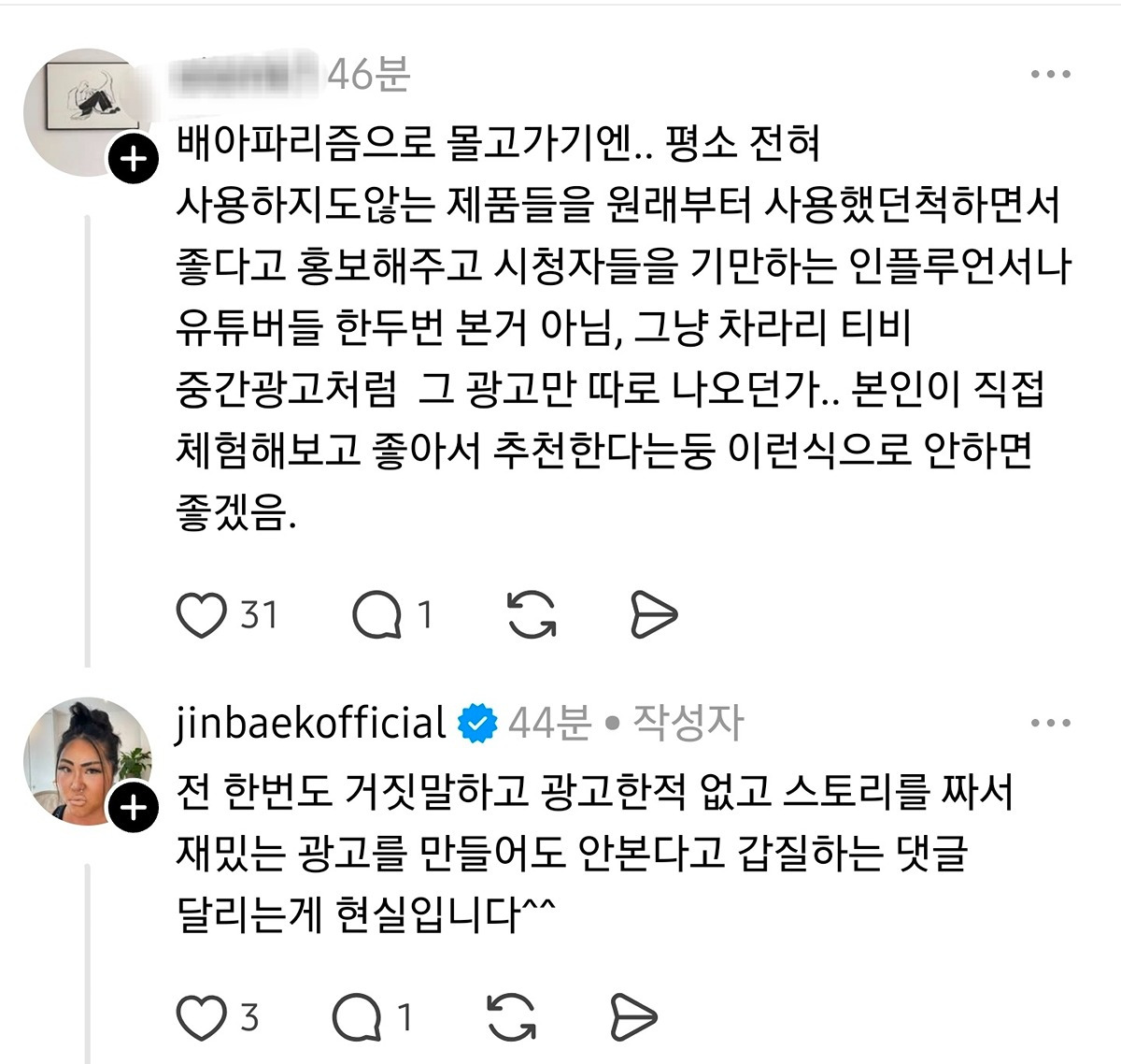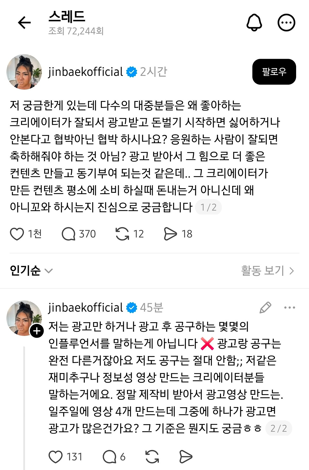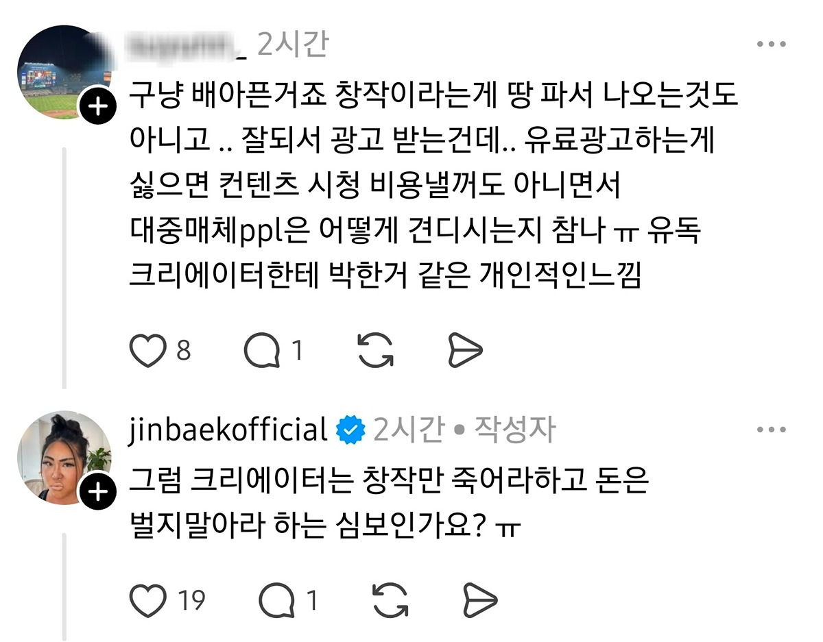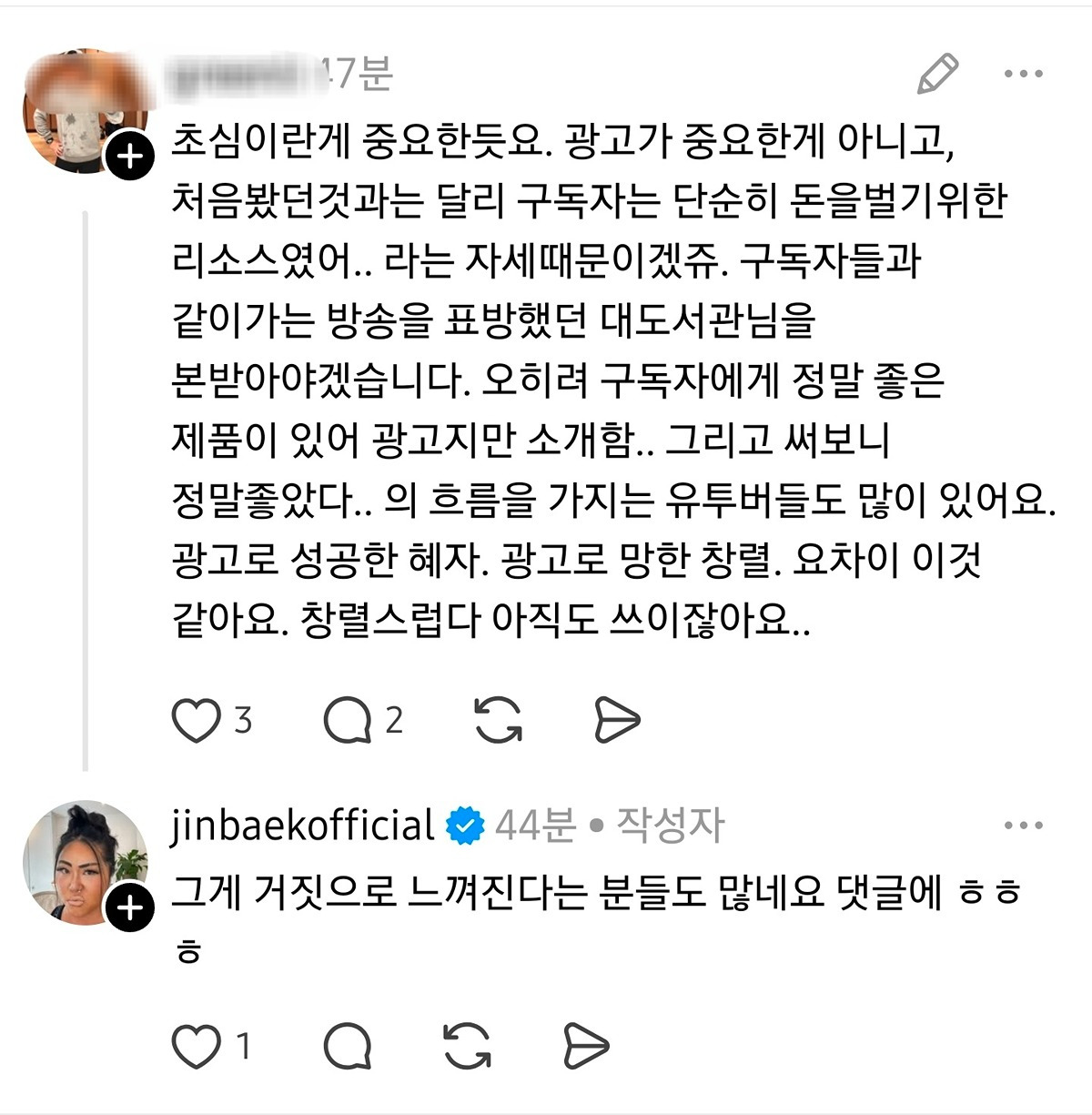 [스크랩] [기타]명예영국인: 다수의 대중분들은 왜 좋아하는 크리에이터가 잘 되서 광고받고 돈벌기 시작하면 싫어하거나 안 본다고 협박 아닌 협박하시나요? 작성자JB|작성시간26.04.03|조회수312 목록 댓글 2 글자크기 작게가 글자크기 크게가 출처: https://theqoo.net/square/4144530929악플땜에 스트레스 많이 받은듯 다음검색 스크랩 원문 : *여성시대* 차분한 20대들의 알흠다운 공간 현재 게시글 추가 기능 열기 북마크 공유하기 신고 센터로 신고 댓글 댓글 2 댓글쓰기 답글쓰기 댓글 리스트 작성자JB | 작성시간 26.04.03 캡쳐된것만 봐서는 좋게좋게 이런거같아요 ~ 한거에도 다 너무 반박하면서 좋게 단 사람들한테도 무안주는 느낌 ..... 작성자JB | 작성시간 26.04.03 누가봐도 화가 잔뜩 나있는거같은데…. 다른 플랫폼은 몰라도 유튜브는 광고수익이 있으니까 꽁짜로 본다는 전혀아닌거같은데 ㅋㅋ 광고를 시청함으로 페이가 되는거지 댓글 전체보기