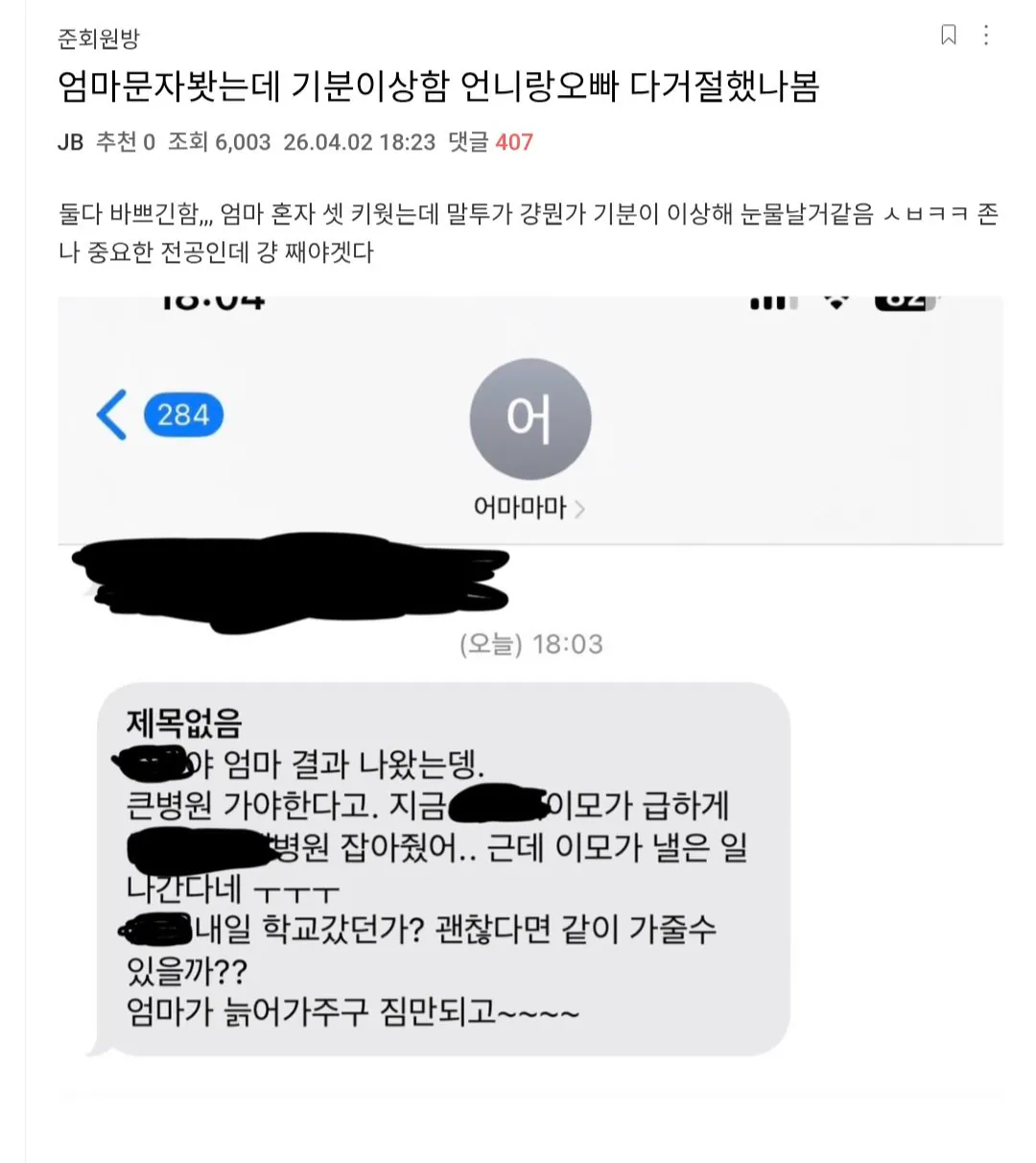 큰병원 같이 가달라고 하는 엄마의 부탁 문자 작성자JB|작성시간26.04.03|조회수563 목록 댓글 2 글자크기 작게가 글자크기 크게가 다음검색 현재 게시글 추가 기능 열기 북마크 공유하기 신고 센터로 신고 댓글 댓글 2 댓글쓰기 답글쓰기 댓글 리스트 작성자JB | 작성시간 26.04.03 하ㅠ ㅅㅂ 작성자JB | 작성시간 26.04.04 이세상모든착한엄마늙지마아프지마ㅠ 댓글 전체보기