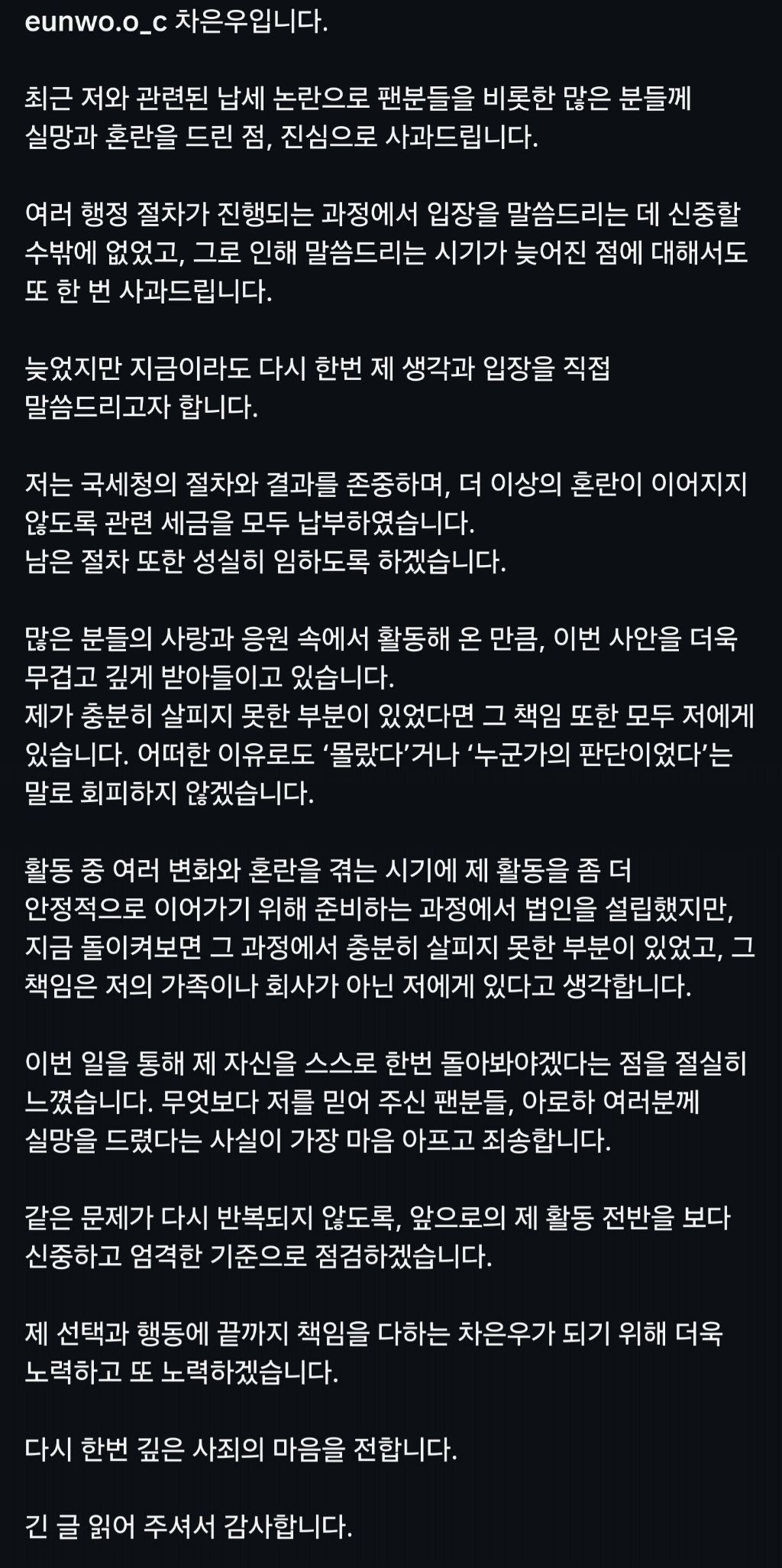 [스크랩] [기타]국세청한테 탈탈 털리고 세금 200억 완납한 차은우 입장문 작성자JB|작성시간26.04.09|조회수1,796 목록 댓글 2 글자크기 작게가 글자크기 크게가 https://m.entertain.naver.com/home/article/468/0001232419[전문] ‘200억 탈세 파문’ 차은우, 결국 백기 “세금 모두 냈다”여기를 눌러 링크를 확인하세요m.entertain.naver.com 다음검색 스크랩 원문 : 樂soccer 현재 게시글 추가 기능 열기 북마크 공유하기 신고 센터로 신고 댓글 댓글 2 댓글쓰기 답글쓰기 댓글 리스트 작성자JB | 작성시간 26.04.09 new 끄지세요 작성자JB | 작성시간 26.04.09 new 지랄노 댓글 전체보기