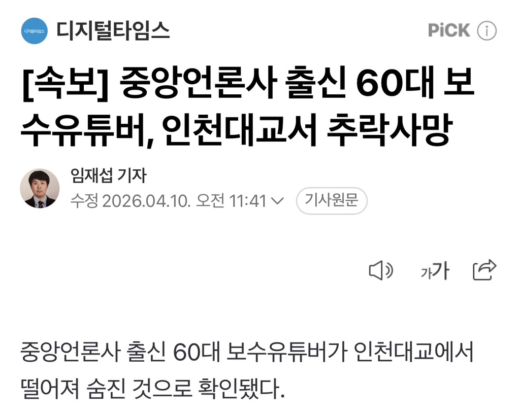 [스크랩] [기사][속보] 중앙언론사 출신 60대 보수유튜버, 인천대교서 추락사망 작성자JB|작성시간26.04.10|조회수261 목록 댓글 1 글자크기 작게가 글자크기 크게가 출처: https://naver.me/Gzd5RsVR[속보] 중앙언론사 출신 60대 보수유튜버, 인천대교서 추락사망중앙언론사 출신 60대 보수유튜버가 인천대교에서 떨어져 숨진 것으로 확인됐다. 10일 인천해양경찰서에 따르면 60대 남성 A씨는 전날 오후 12시 37분 인천대교 주탑 인근(송도 방향)에서 바다로 n.news.naver.com전문출처 다음검색 스크랩 원문 : *여성시대* 차분한 20대들의 알흠다운 공간 현재 게시글 추가 기능 열기 북마크 공유하기 신고 센터로 신고 댓글 댓글 1 댓글쓰기 답글쓰기 댓글 리스트 작성자JB | 작성시간 26.04.10 new 헐 댓글 전체보기