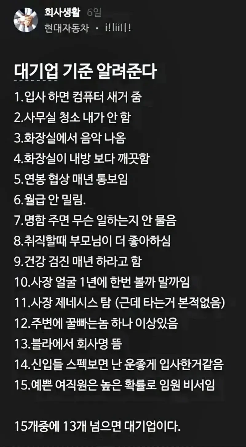 [기타]대기업 기준을 알려줄께 작성자JB|작성시간26.04.14|조회수5,765 목록 댓글 1 글자크기 작게가 글자크기 크게가 다음검색 현재 게시글 추가 기능 열기 북마크 공유하기 신고 센터로 신고 댓글 댓글 1 댓글쓰기 답글쓰기 댓글 리스트 작성자JB | 작성시간 26.04.14 대기업에 ㅈㄴ취했네 검색만 해도 대기업 리스트 다 뜨는데 댓글 전체보기