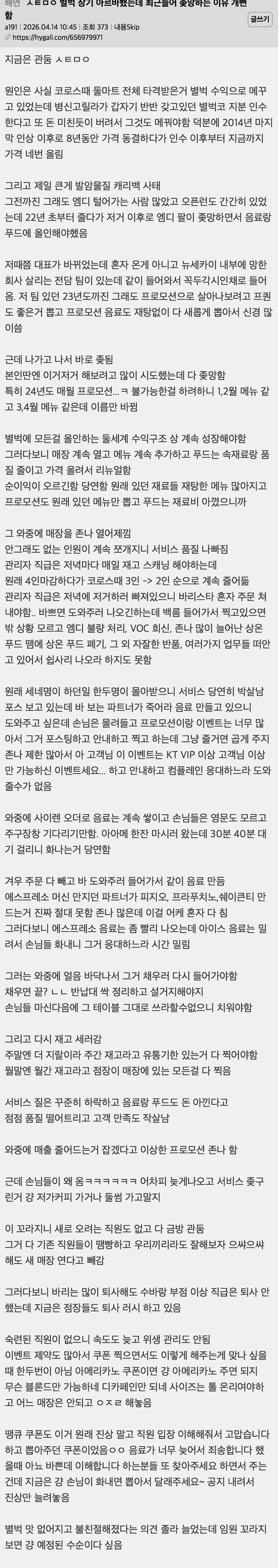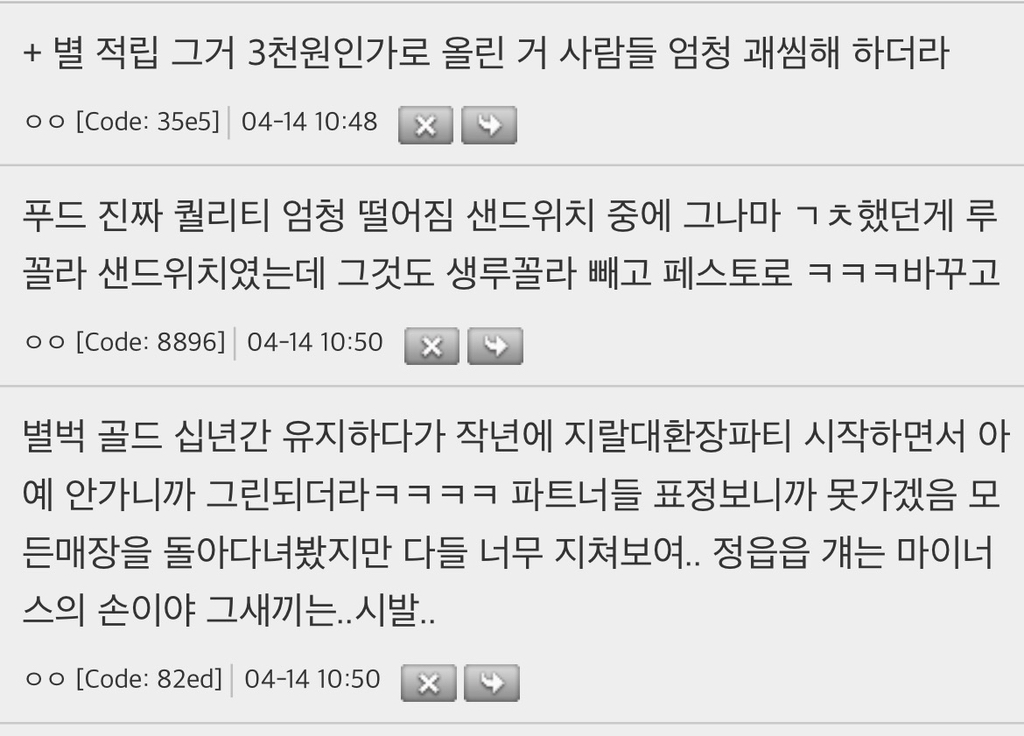 [스크랩] [기타]스벅 장기 알바했는데 최근들어 망하는 이유 개뻔함 작성자JB|작성시간26.04.14|조회수632 목록 댓글 2 글자크기 작게가 글자크기 크게가 출처: https://hygall.com/656979971 다음검색 스크랩 원문 : *여성시대* 차분한 20대들의 알흠다운 공간 현재 게시글 추가 기능 열기 북마크 공유하기 신고 센터로 신고 댓글 댓글 2 댓글쓰기 답글쓰기 댓글 리스트 작성자JB | 작성시간 26.04.14 ㅈㄴ우리회사같다 작성자JB | 작성시간 26.04.14 정용진 으이구 댓글 전체보기