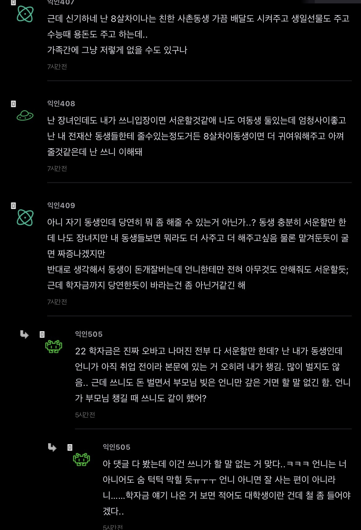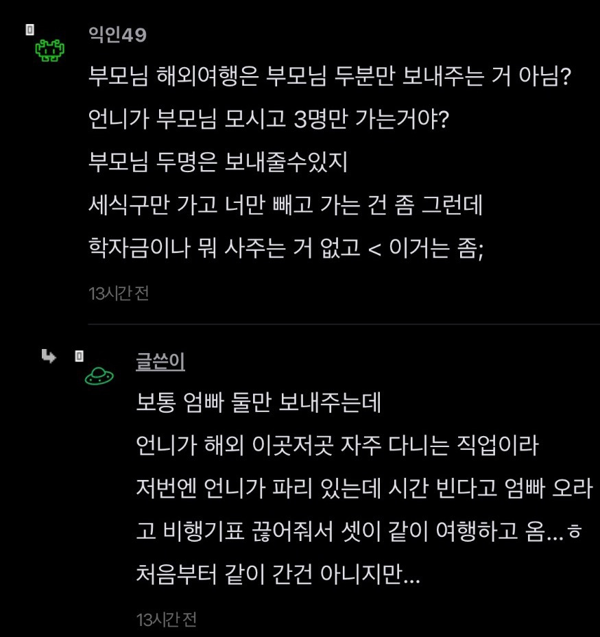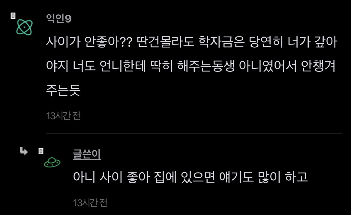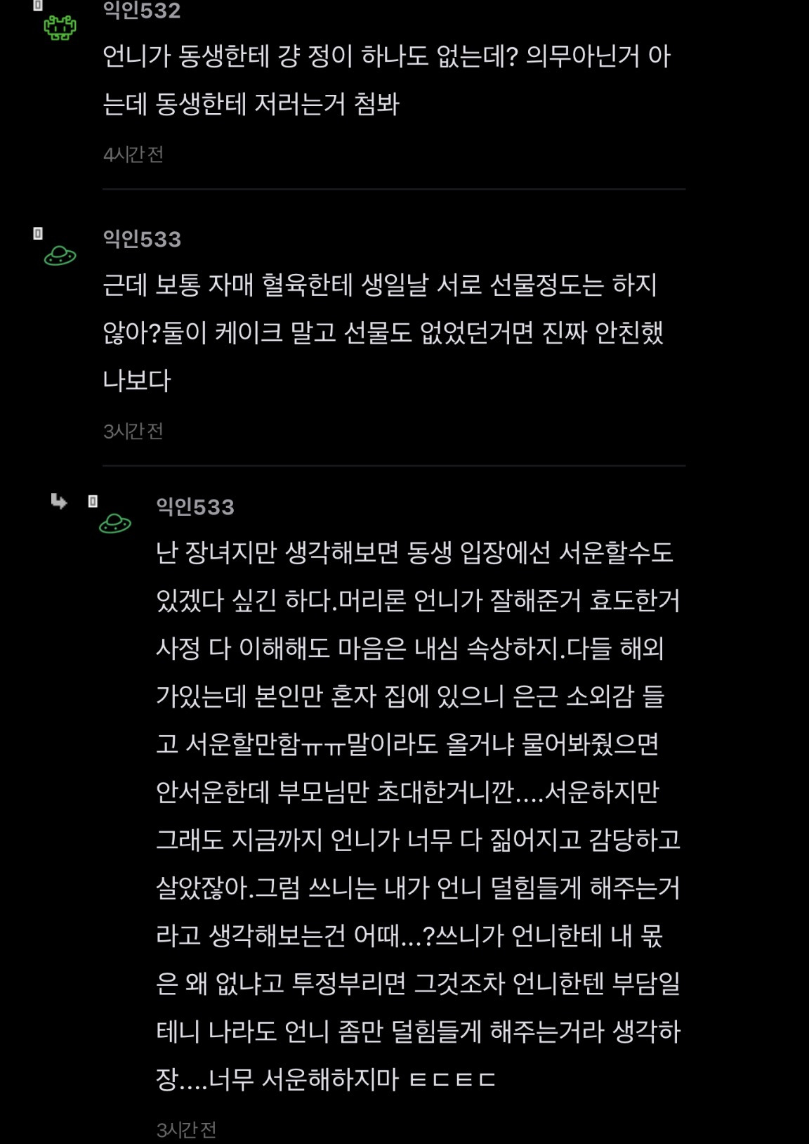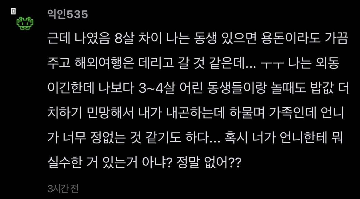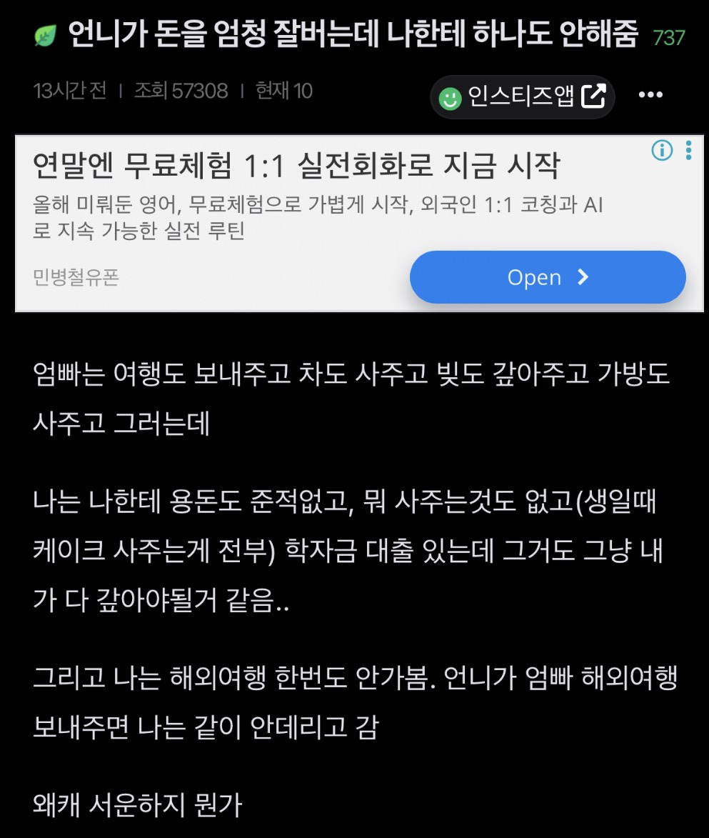[스크랩] [기타]언니가 돈을 엄청 잘버는데 나한테 하나도 안해줌 작성자JB|작성시간26.04.15|조회수351 목록 댓글 2 글자크기 작게가 글자크기 크게가 출처: https://www.instiz.net/name/65178360 다음검색 스크랩 원문 : *여성시대* 차분한 20대들의 알흠다운 공간 현재 게시글 추가 기능 열기 북마크 공유하기 신고 센터로 신고 댓글 댓글 2 댓글쓰기 답글쓰기 댓글 리스트 작성자JB | 작성시간 26.04.15 new 당연히 해줄필요는 없는데 내가 언니면 학자금 갚는거까지는 아니어도 그정도는 해줄거같음 여덟살 어린 동생한텐 더더욱 작성자JB | 작성시간 26.04.15 new 8살차이면 크면서 기저귀가는것도 보고 젖병도 한번쯤 물려봤을만한 나이차이인데 저렇게까지 등한시하는거면 뭐 있나 싶을정도인데.... 댓글 전체보기