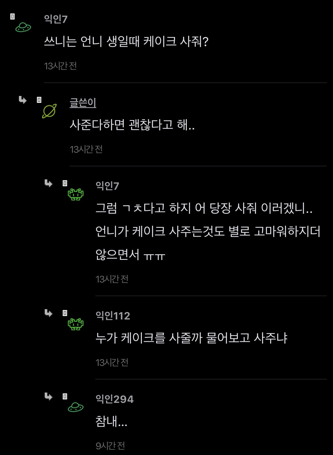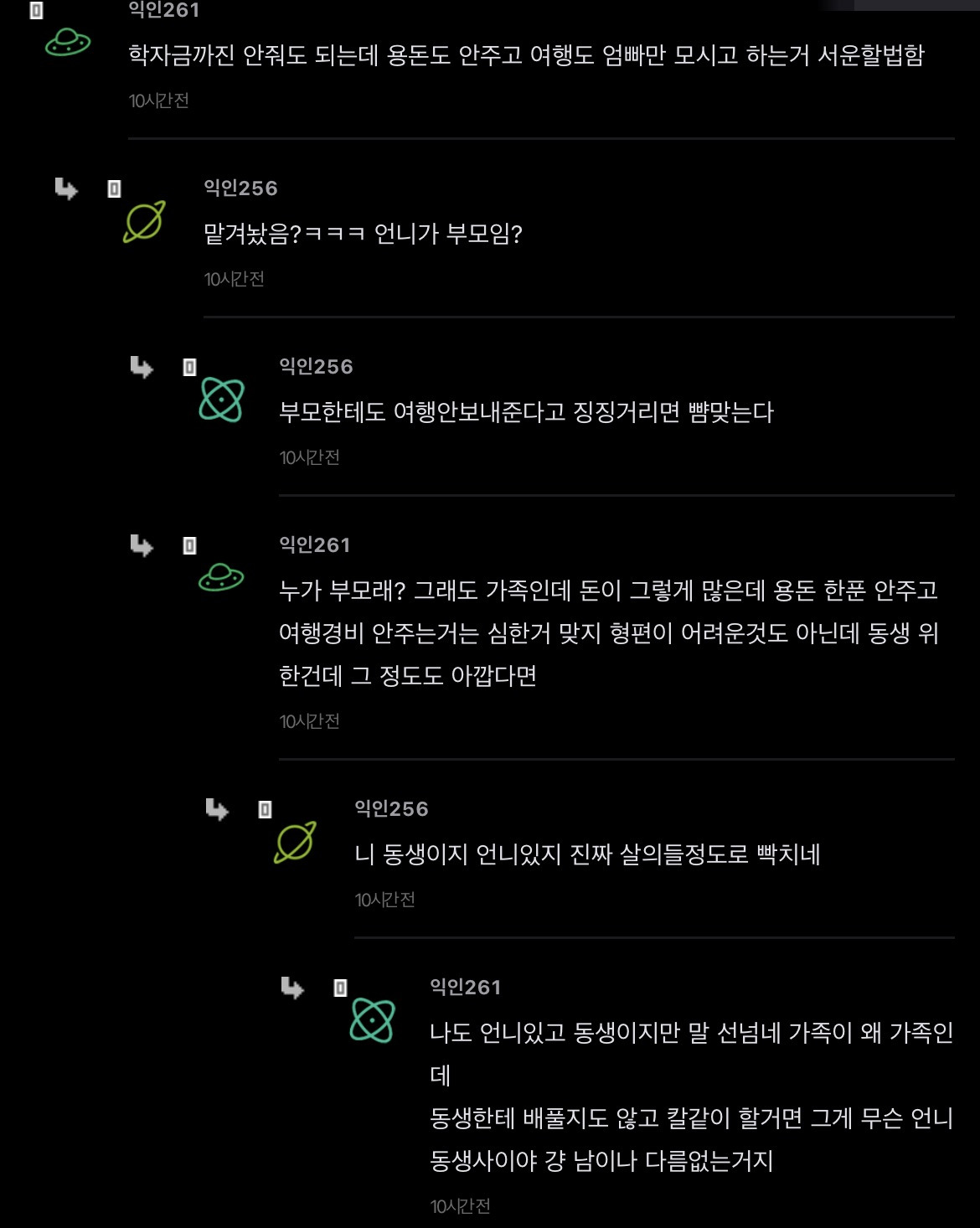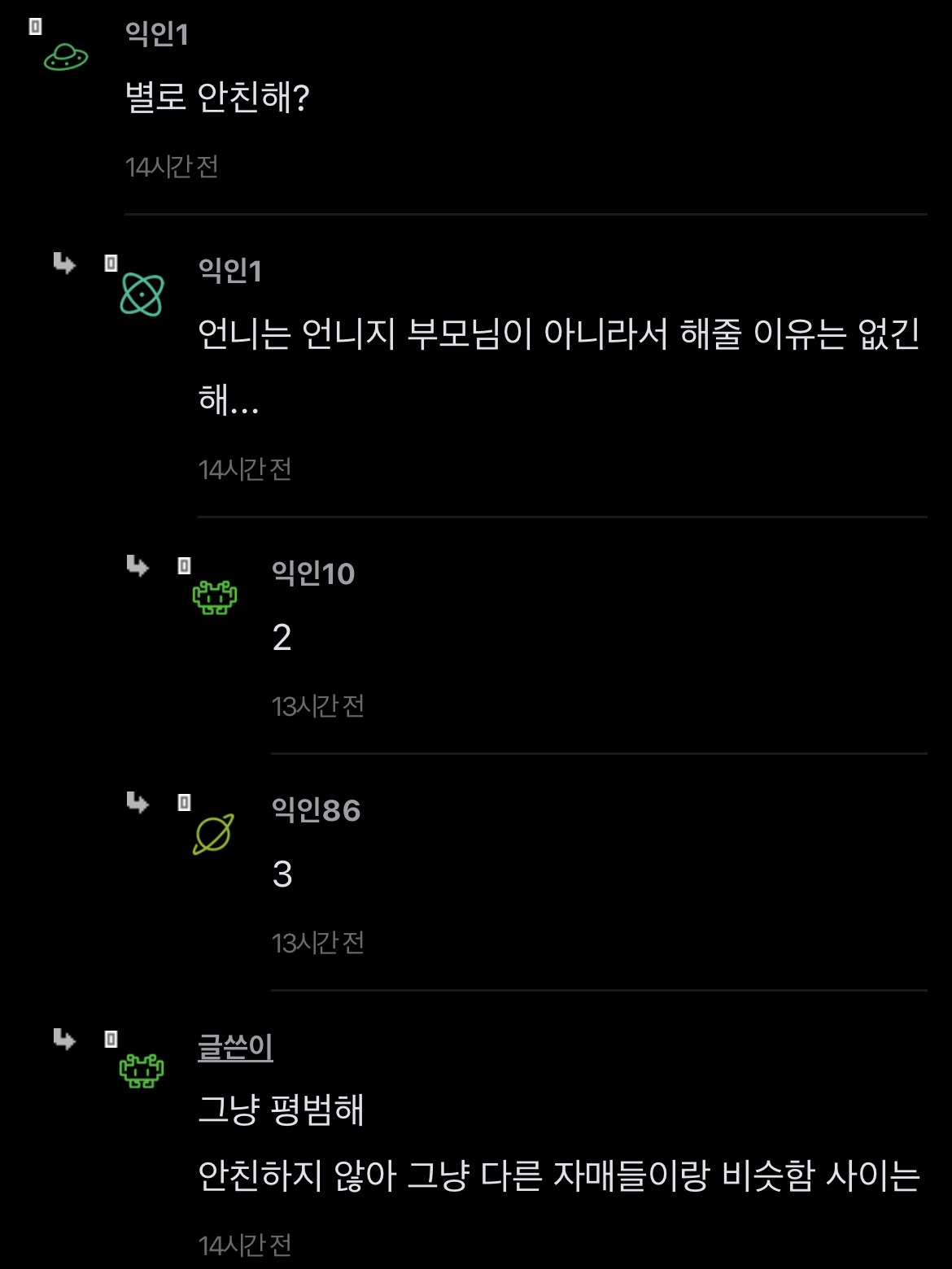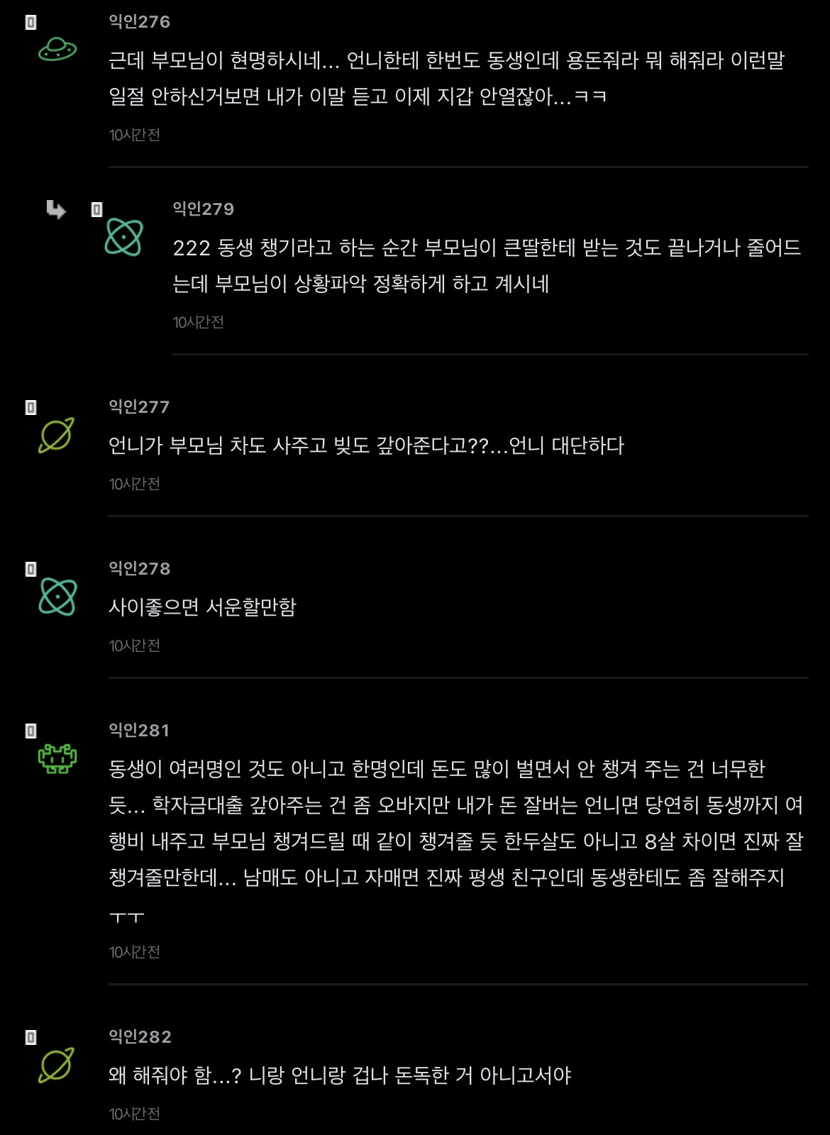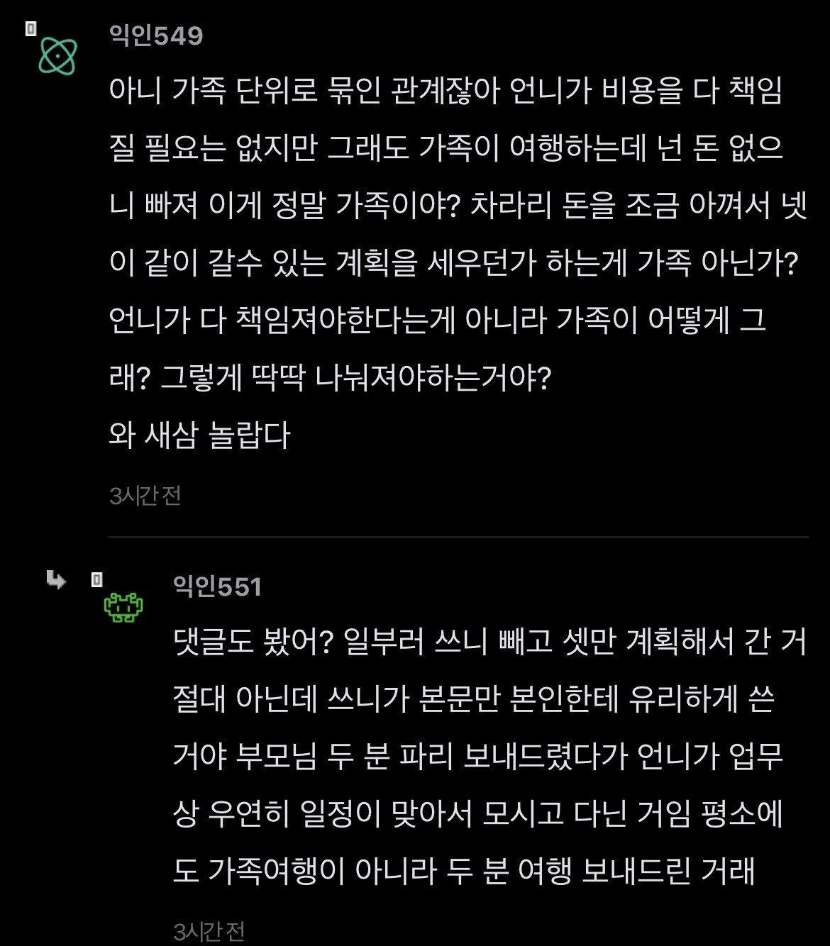 [스크랩] [기타]언니가 돈을 엄청 잘버는데 나한테 하나도 안해줌 작성자JB|작성시간26.04.15|조회수351 목록 댓글 2 글자크기 작게가 글자크기 크게가 출처: https://www.instiz.net/name/65178360 다음검색 스크랩 원문 : *여성시대* 차분한 20대들의 알흠다운 공간 현재 게시글 추가 기능 열기 북마크 공유하기 신고 센터로 신고 댓글 댓글 2 댓글쓰기 답글쓰기 댓글 리스트 작성자JB | 작성시간 26.04.15 new 당연히 해줄필요는 없는데 내가 언니면 학자금 갚는거까지는 아니어도 그정도는 해줄거같음 여덟살 어린 동생한텐 더더욱 작성자JB | 작성시간 26.04.15 new 8살차이면 크면서 기저귀가는것도 보고 젖병도 한번쯤 물려봤을만한 나이차이인데 저렇게까지 등한시하는거면 뭐 있나 싶을정도인데.... 댓글 전체보기