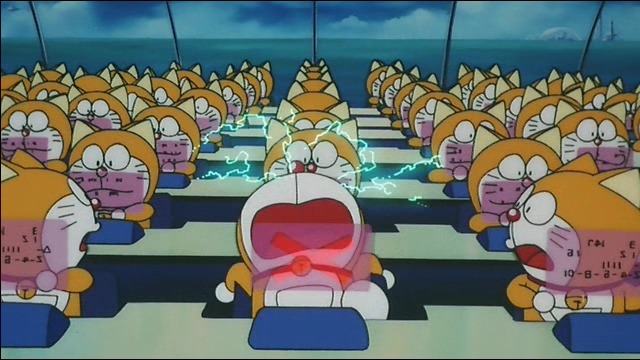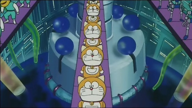 22세기 로봇공장에서 수많은 도라에몽들이 태어났어