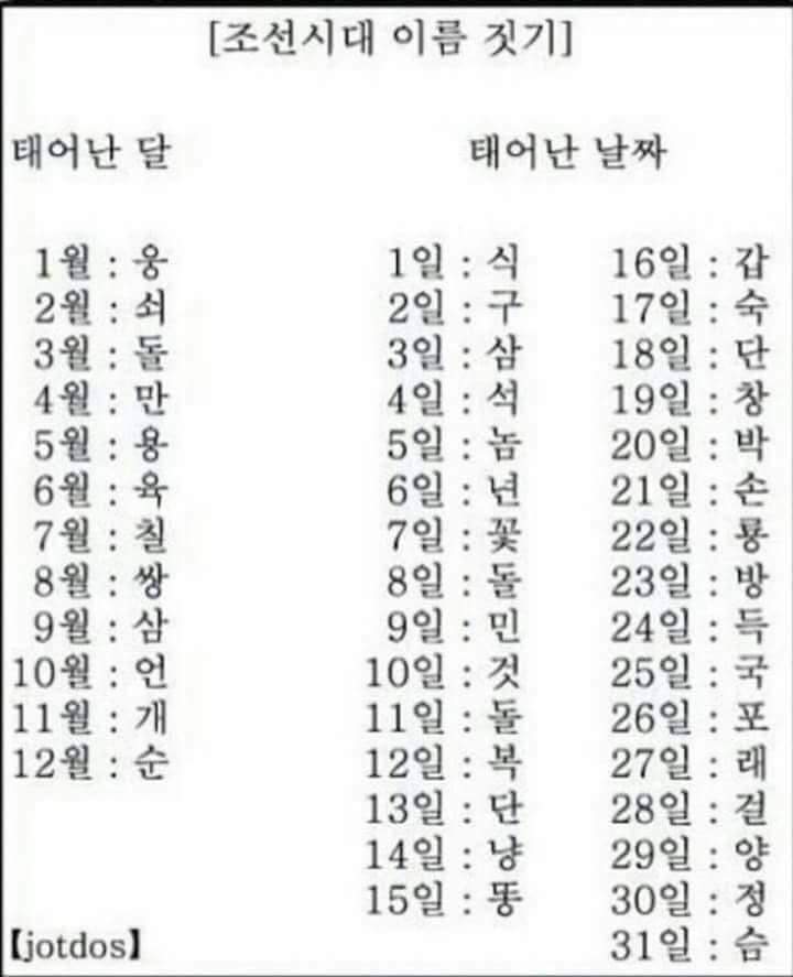 [기타]조선시대식 이름 짓기 작성자마주잡았던 두 손 흩어지네|작성시간16.02.29|조회수4,488 목록 댓글 164 글자크기 작게가 글자크기 크게가 ㅊㅊ. 페북 김산나는 순정임..!존예..;;;조합해보니까 이게제일예쁜듯ㅋㅋㅋㅋ문제시 쿵혜가 책상을 근근 침 다음검색 현재 게시글 추가 기능 열기 북마크 공유하기 신고 센터로 신고 댓글 댓글 164 댓글쓰기 답글쓰기 댓글 리스트 작성자청정한우 | 작성시간 16.02.29 순박잌ㅋㅋㅋㅋㅋㅋㅋㅋㅋㅋㅋ 작성자윈터강동원 | 작성시간 16.02.29 언꽃 예쁘다.... 답댓글 작성자윈터강동원 | 작성시간 16.02.29 아니 댓글 존나웃곀ㅋㅋㅋㅋㅋㅋㅋㅋㅋㅋㅋㅋㅋ 작성자밥끄네 | 작성시간 16.02.29 돌걸이ㅎ옷걸ㅎ이같고 좋ㅎ네 작성자@taka4848mina | 작성시간 17.01.12 순꽃 댓글 전체보기