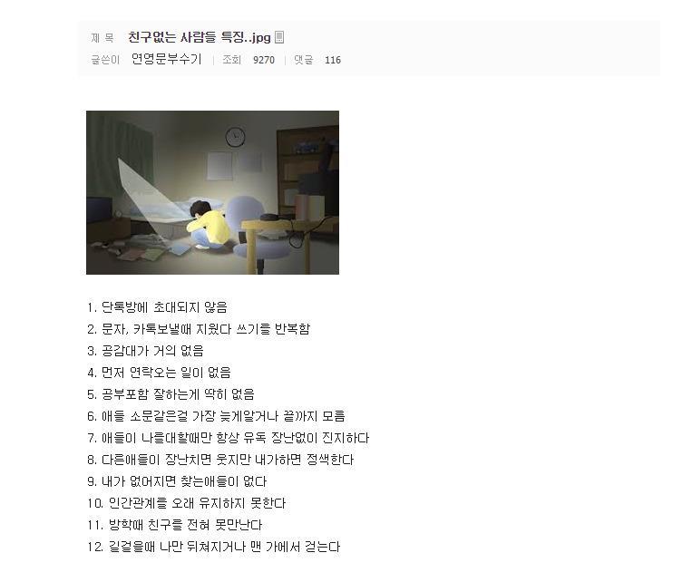 [스크랩] [기타]친구 없는 사람 특징.jpg 작성자칠리치즈맛|작성시간16.03.26|조회수14,355 목록 댓글 32 글자크기 작게가 글자크기 크게가 다음검색 스크랩 원문 : 아이러브사커 현재 게시글 추가 기능 열기 북마크 공유하기 신고 센터로 신고 댓글 댓글 32 댓글쓰기 답글쓰기 댓글 리스트 작성자카드캡터임체리 | 작성시간 16.03.26 그림부터 글까지 슬프다 작성자충분히이쁨 | 작성시간 16.03.26 나넿ㅎㅎ... 작성자잡덕인생 | 작성시간 16.03.26 ㅎ.. 작성자내일의 태양이 뜰테니까 | 작성시간 16.03.26 다나네 작성자아류03 | 작성시간 16.03.27 공부 빼고 다 난데!!최소한의 인간관계는 유지하고 싶은데 그렇다고 이 사람 저 사람 만나면서 확장하고 싶진 않아 댓글 전체보기