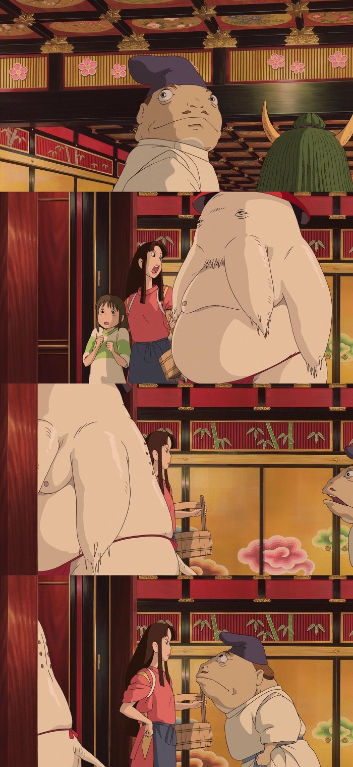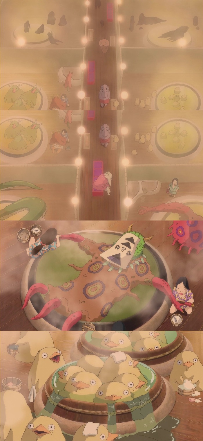 목욕을 하고있는 신들이 보이고 치히로는 그걸 빤히 쳐다봄