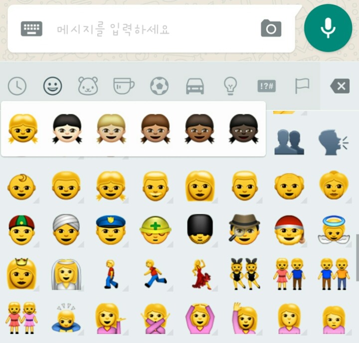 첫번째로, 기본으로 드러나는 이모티콘 캐릭터의 피부색은 노란색이지만, 오른쪽 아래 끄트머리에 작은 삼각형이 있는 이모티콘은 터치하면 다른 머리색과 피부색, 하지만 같은 모양의 이모티콘들이 나타나.