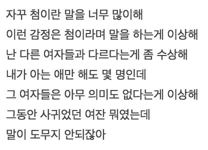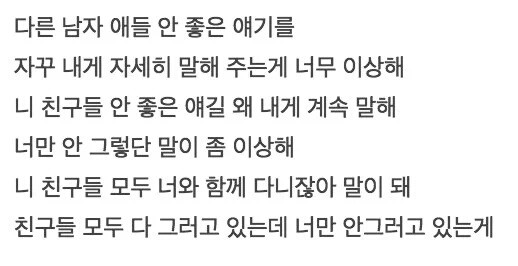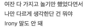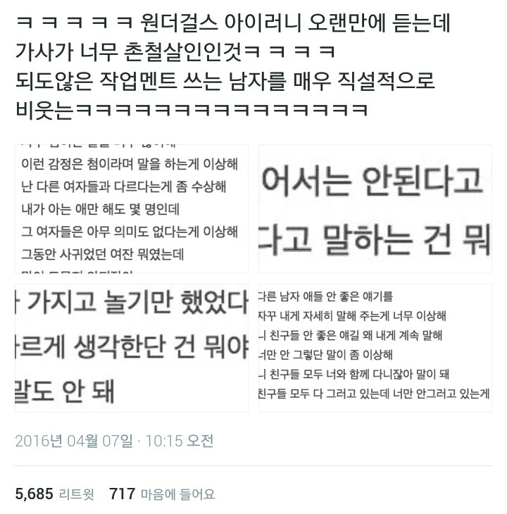 [기타]이쯤에서 다시보는 원더걸스 아이러니 가사 작성자빅스 건들면 다 뒤지는거다|작성시간16.07.08|조회수92,401 목록 댓글 28 글자크기 작게가 글자크기 크게가 팬 아니고 가사가 넘나 멋져서 가져왔는데 혹시라도 문제있으면 말해주세요 :) 다음검색 현재 게시글 추가 기능 열기 북마크 공유하기 신고 센터로 신고 댓글 댓글 28 댓글쓰기 답글쓰기 댓글 리스트 답댓글 작성자iKONBOBBY | 작성시간 16.07.08 엥 아이러니뮤비에 그런장면없어 작성자이유가 뭐지 | 작성시간 16.07.08 아 미친ㅋㅋㅋㅋㅋㅋㅋㅋㅋㅋㅋㅋㅋㅋㅋㅋㅋㅋㅋㅋㅋㅋ 작성자벌레는 단어도 징그러 | 작성시간 16.07.08 소희 캐쏭말해 킬링파트 답댓글 작성자류주녈 | 작성시간 16.07.08 캐쏭!마래~ 작성자니들도 늙어봐ㅠㅠ | 작성시간 16.07.08 맞아맞아 배드걸굿걸 아직도 자존감 떨어질 때 나도 모르게 흥얼거리는 노래 댓글 전체보기