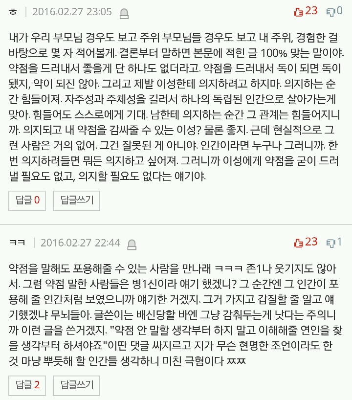 작성자ㅂㅈㄷㄱㅅㅋ 작성시간 16.07.11 난 본문도 댓글도 이해감.. 근데 진짜 힘들때는 나한테 기대는게 답인듯. 약점은 진짜 말하는 순간 나한테 독으로 올수 있음..
