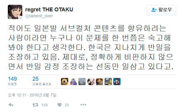 작성자김스한무 작성시간 16.08.09 오타쿠 걍 별생각없었는데 트위터하면서 좀 싫어짐 약간 최소한의 도덕도 무시하는애들 너무많음 특히 남덕들