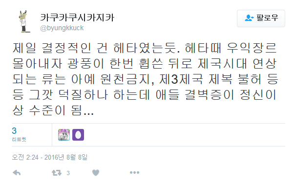 보다 너무 화가 나서 들고왔다. ★글 어디로든 불펌 환영.★ 헤타리아가 괜히 동인계에서 퇴출당하고 낙인찍혀 내려간게 아닌데 요즘 자꾸 이런 빻은 소리들이 알티되서 참 깝깝함...