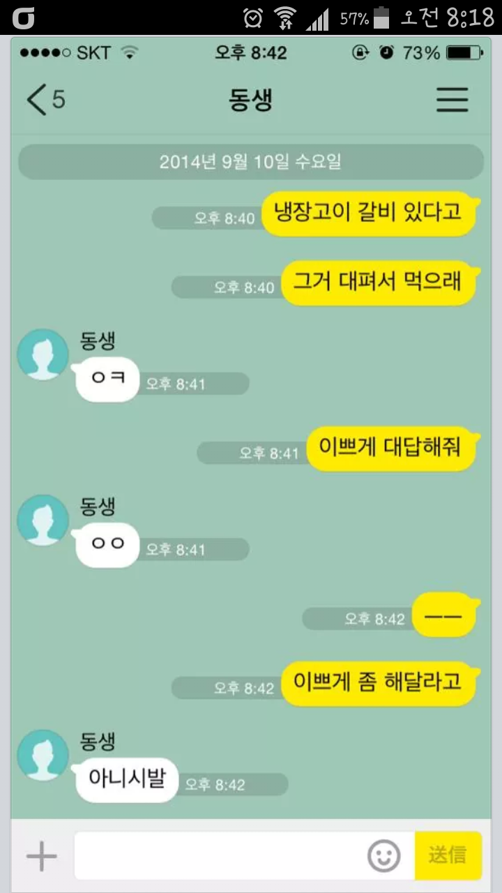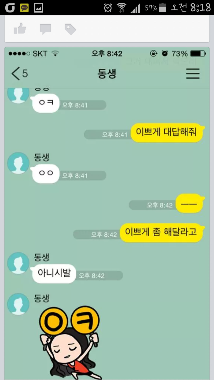 [스크랩] [유머]착한남동생과 누나의 카톡.jpg 작성자웃음 전도사♡|작성시간16.08.19|조회수73,807 목록 댓글 15 글자크기 작게가 글자크기 크게가 . 다음검색 스크랩 원문 : 도탁스 (DOTAX) 현재 게시글 추가 기능 열기 북마크 공유하기 신고 센터로 신고 댓글 댓글 15 댓글쓰기 답글쓰기 댓글 리스트 작성자엄놀 | 작성시간 16.08.19 아 존나 웃김ㅋㅋㅋ 작성자오이소박이2 | 작성시간 16.08.19 근데 왜 이름이 동생으로 돼있지 누나라고 돼있어야 하는거 아닌갸? 작성자대퇴부미인 | 작성시간 16.08.19 헐내동생인줄ㅋㅋㅋㅋㅋㅋㅋㅋㅋㅋㅋㅋㅋㅋㅋㅋㅋㅋ 작성자몰아애(沒我愛) | 작성시간 16.08.25 ㅋㅋㅋㅋㅋㅋㅋㅋㅋ 작성자보보보보보보보보보보보보보 | 작성시간 16.08.29 미친ㅋㅋㅋㅋㅋㅋㅋㅋ 댓글 전체보기