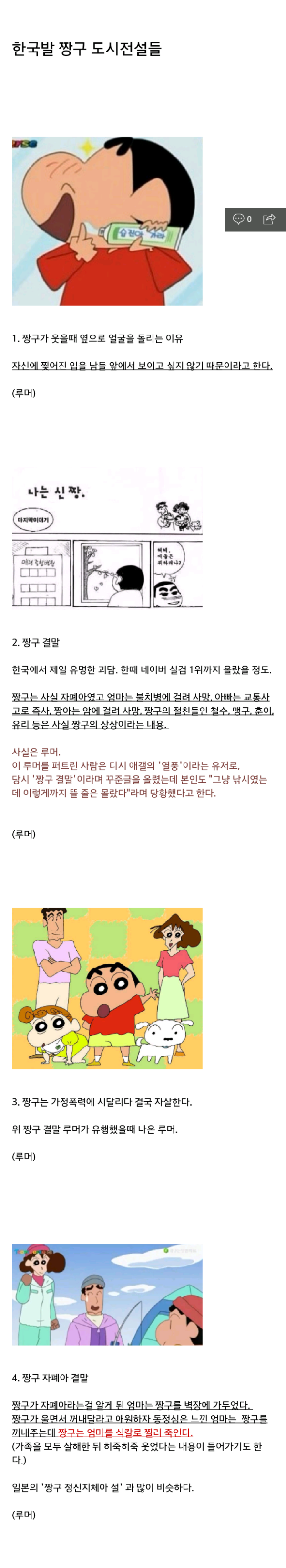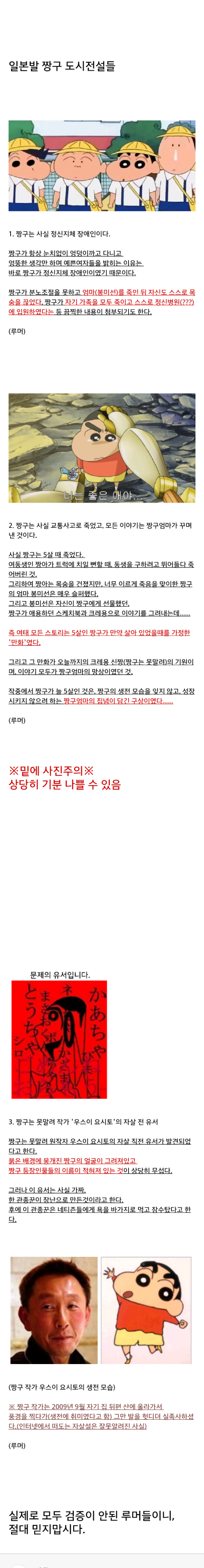 [스크랩] [기타](공포,소름,사진주의) 인기만화 `짱구는 못말려`의 무서운 괴담들 작성자cokecola|작성시간16.09.28|조회수9,206 목록 댓글 22 글자크기 작게가 글자크기 크게가 (미방)끝에 소름끼치는 사진나옵니다(짱구작가 유서)물론 루머지만 보고 엄청 기분나쁠수도 있으니 심약/멘탈약한분들 주의ㅊㅊ 네이버뿜 다음검색 스크랩 원문 : 쭉빵카페 현재 게시글 추가 기능 열기 북마크 공유하기 신고 센터로 신고 댓글 댓글 22 댓글쓰기 답글쓰기 댓글 리스트 작성자변백현 (25) | 작성시간 16.09.28 아 아오 짱구건들지마라 ㅅㅂ 아무서워 작성자도날드덕여친데이지 | 작성시간 16.09.28 다들 요즘짱구를 안봐서그래ㅠㅠ 최근시즌들보면 씹덕도진짜많고 개그포인트도많고 자폐소리 절대안나옴ㅠㅠ 작성자류정환` | 작성시간 16.09.29 미방ㅋㅋㅋㅋㅋㅋㅅㅂㅋㅋㅋㅋㅋ 작성자@키르아 조르딕 | 작성시간 16.09.29 ㅁㅋㅊㅋㅋㅋㅋㅋㅋㅋㅋㅋㅋㅋㅋㅋㅋㅋ 작성자짱구철수유리훈이맹구 | 작성시간 16.10.08 실족사 하신것도 루머라고? 댓글 전체보기