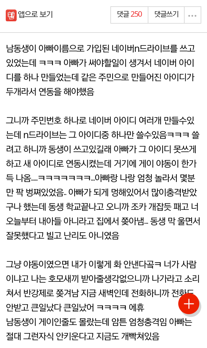 작성자샤이니는 9세, 나의 구세주 작성시간 16.10.18 진짜 저딴 집안에서 태어난게 너무 안쓰럽다..내 동생 해ㅠㅠㅠ 그리고 무슨 게동 보면 게이야ㅋㅋㅋ 나도 가끔 심심할때 보는뎁..ㅇㅅㅇ