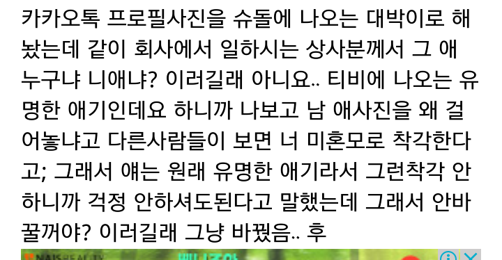 ㅈㄴ싫어 난 평일과 주말과 얼굴이 다른데 주말얼굴 프사해놓으니까 과장님이 ㅇㅇ씨 프사 ㅇㅇ씨예요? ㅎ 좀 다르던데 이러는데 복학생이 프사너야 ㅎ? 한거같아서 시렀음