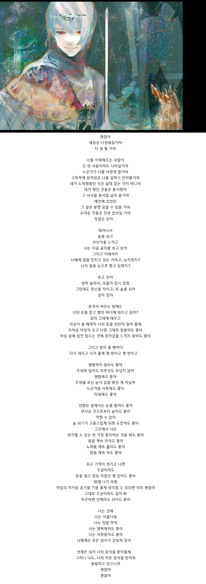 이 와중에 '너를 잃은 세상은 보기 싫은 아지랑이 같다'고 독백하기도 한다