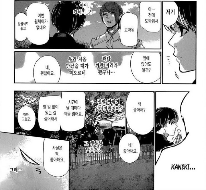 친구가 되자며 접근해 책 이야기를 나누며 카네키의 흥미를 끈다