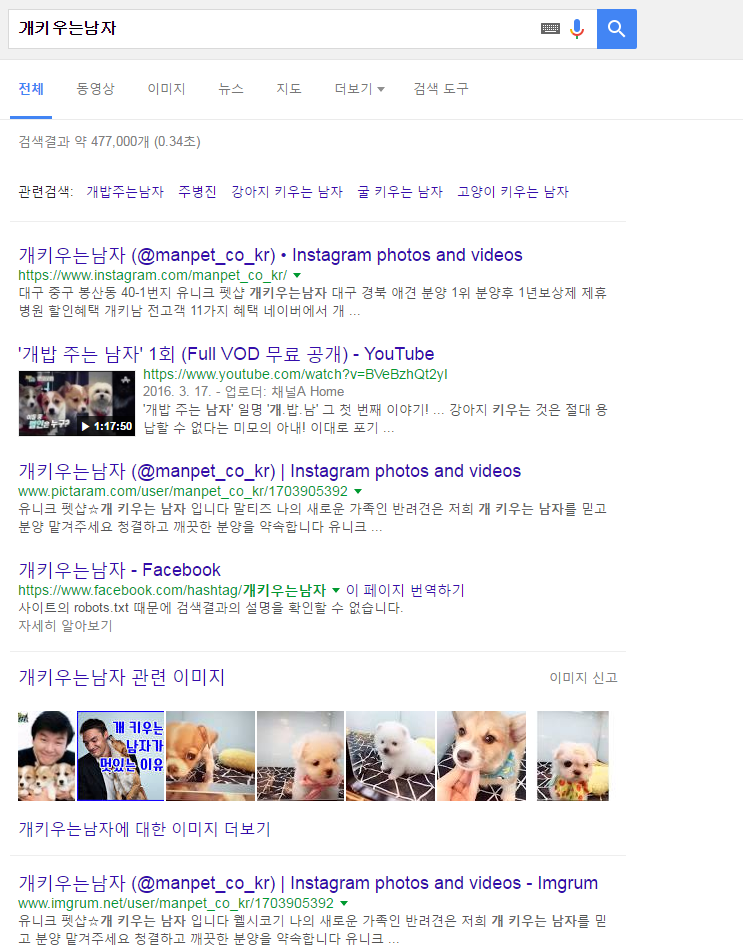 아래는 '개키우는남자', '강아지키우는남자' 등을 검색했을때 보이는것들임