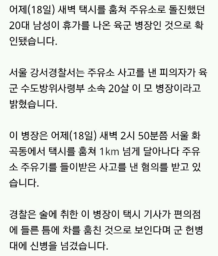 [기사]휴가 나온 육군 병장이 택시 훔쳐 주유소 돌진 작성자김문어숙회|작성시간16.12.19|조회수5,042 목록 댓글 14 글자크기 작게가 글자크기 크게가 사람이라도 박았으면 어쩌려고 술처먹고 운전을 하냐.. 게다가 절도까지 ㅇㅅㅠhttp://naver.me/GOcTZXqQ링크 들어가면 뉴스 동영상 있어! 다음검색 현재 게시글 추가 기능 열기 북마크 공유하기 신고 센터로 신고 댓글 댓글 14 댓글쓰기 답글쓰기 댓글 리스트 작성자세훈아 결혼해줘 제발 | 작성시간 16.12.19 잦댔네 작성자Sugarsweet | 작성시간 16.12.19 왜저래... 작성자안녕내이름은디보 | 작성시간 16.12.19 아니 대체 왜..... 작성자내남친신효섭 | 작성시간 16.12.19 아..한심;; 인명피해라도있었으면 어쩔뻔햇냐.. 술처마셧으면 ..곱게 걍..집을가지 휴가까지나와서..뭔짓이여 작성자잭니클라우스 | 작성시간 16.12.19 ㅁㅊㅅㅋ.. 댓글 전체보기