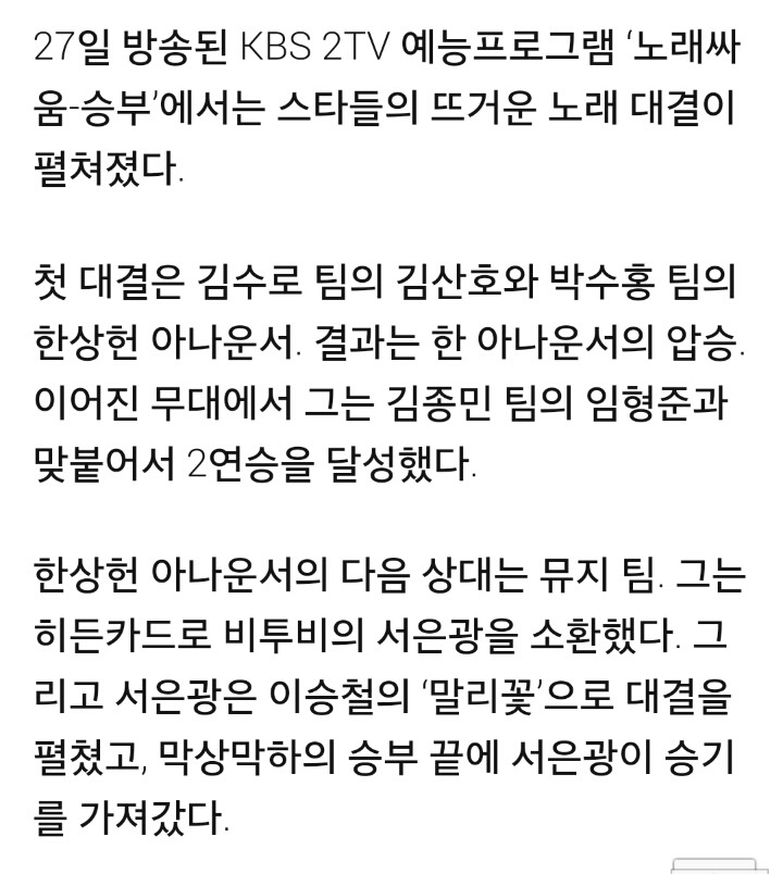 [기사]‘노래싸움’ 서은광, 한성헌 3연승 저지..히든카드 활약 작성자비투비는 못하는 게 뭐야?|작성시간17.01.27|조회수2,462 목록 댓글 34 글자크기 작게가 글자크기 크게가 기사전문☞ http://m.entertain.naver.com/read?oid=109&aid=0003469798영상주소☞ http://naver.me/GSvqLG7M문제시은광이랑 떡국먹으러감 다음검색 현재 게시글 추가 기능 열기 북마크 공유하기 신고 센터로 신고 댓글 댓글 34 댓글쓰기 답글쓰기 댓글 리스트 작성자jJjjJJJjjJ | 작성시간 17.01.27 진짜 노래 존잘이라구... 최고라구... 작성자앓다죽을비투비 | 작성시간 17.01.28 응가ㅠㅠㅠㅠㅠㅠ최고야ㅠㅠㅠㅠㅠㅠㅠㅠㅠㅠㅠ 작성자현식아사랑해 | 작성시간 17.01.28 응강이 싸랑해ㅜㅜ 천사야 💙 작성자박서준아내 | 작성시간 17.01.28 우리응가ㅠㅠㅜㅜㅜㅜㅜㅜㅜ잘했어우ㅜㅜㅜㅠㅠㅠㅜ 작성자서은광앉아은광 | 작성시간 17.01.28 크....👍🏻👍🏻👍🏻👍🏻👍🏻👍🏻👍🏻👍🏻아무리봐도ㅠㅠㅠ 댓글 전체보기