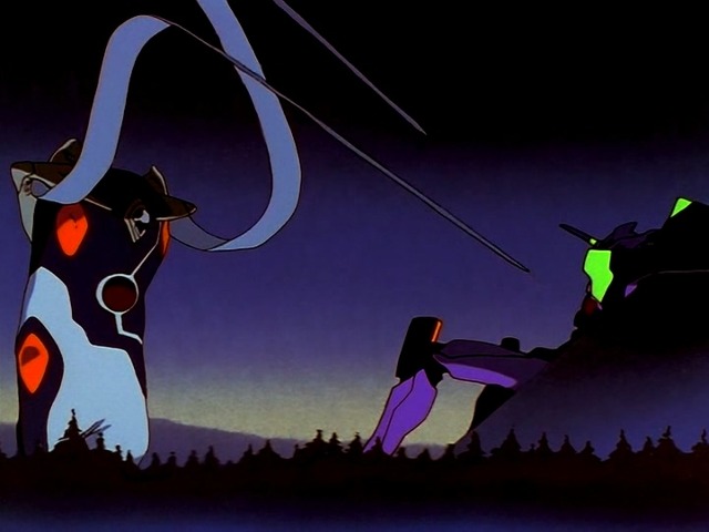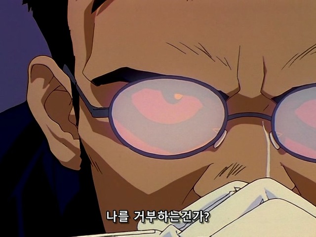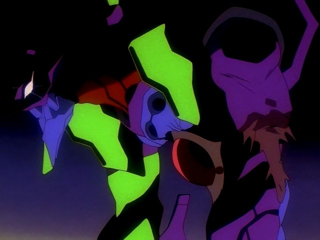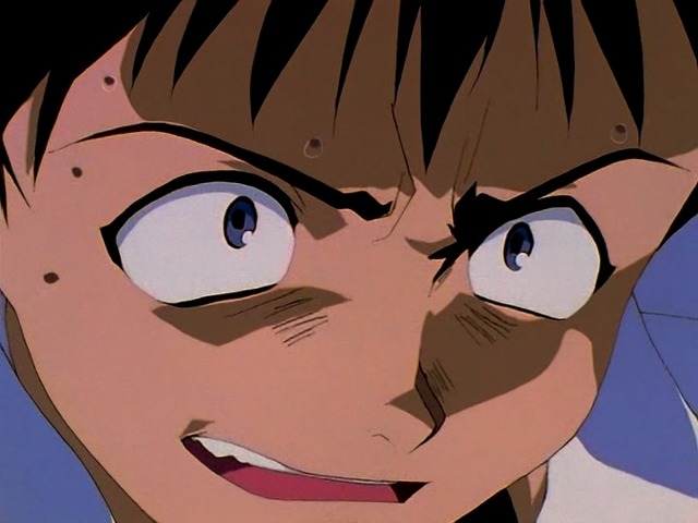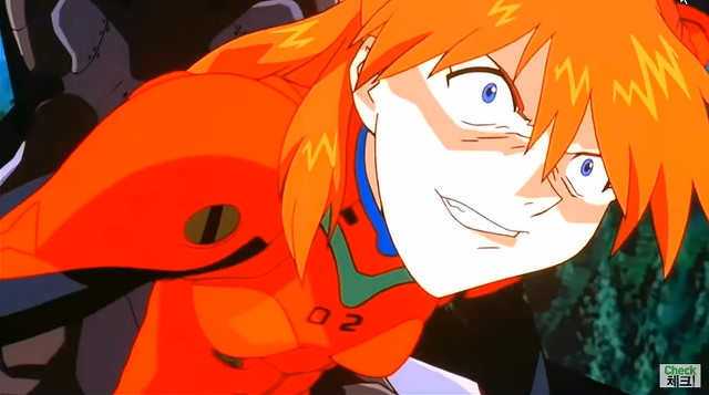 엔드 오브 에바에서 양산형 에바와 싸우는 장면에서 보이는 신지와 같은 아스카의 음험한 표정