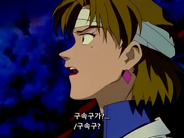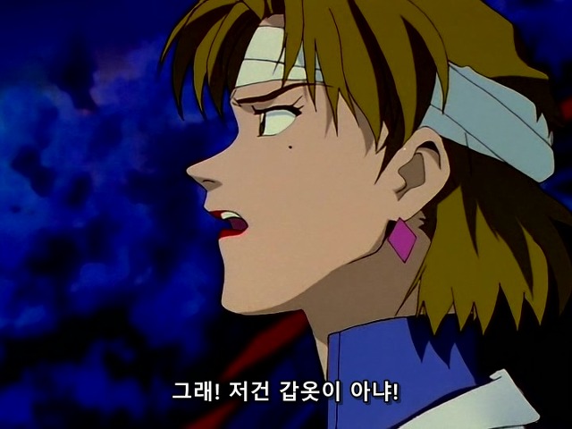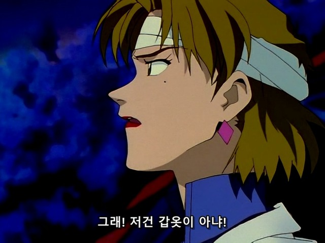 제르엘과 싸우면서 음험한 표정을 짓는 신지