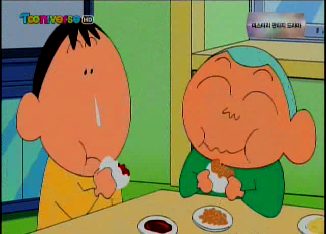 31. 온몸이 시뻘건 상태로 뭔가를 먹는 맹구와 훈이
