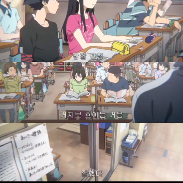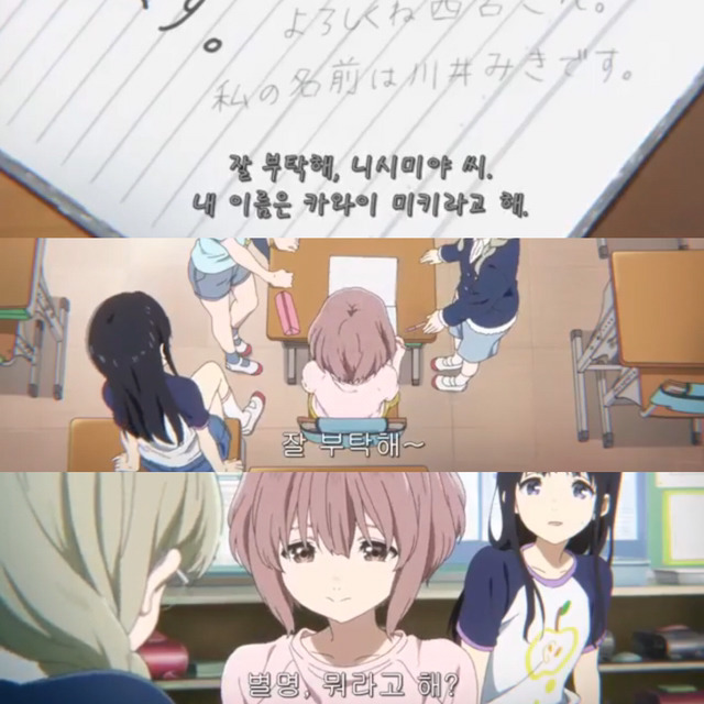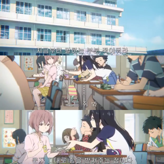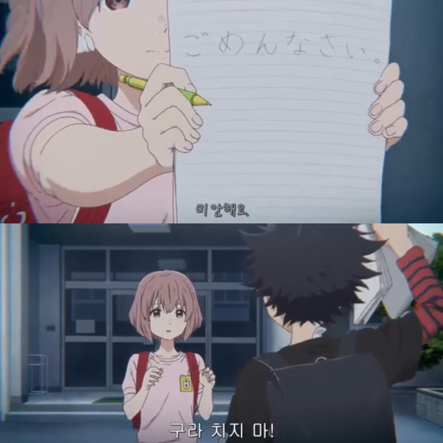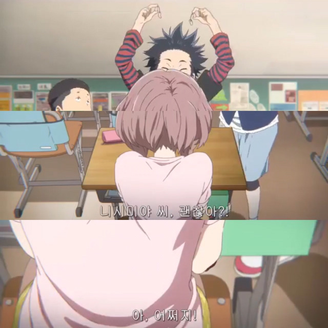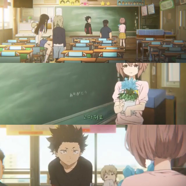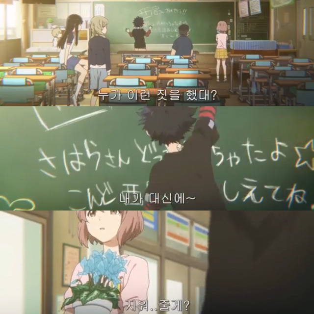 이시다 책상에 쓰인 나쁜말들을 본 쇼코가 이시다가 오기 전에 다 닦아놓음 하지만 이시다는 쇼코가 마냥 짜증나고 싫음