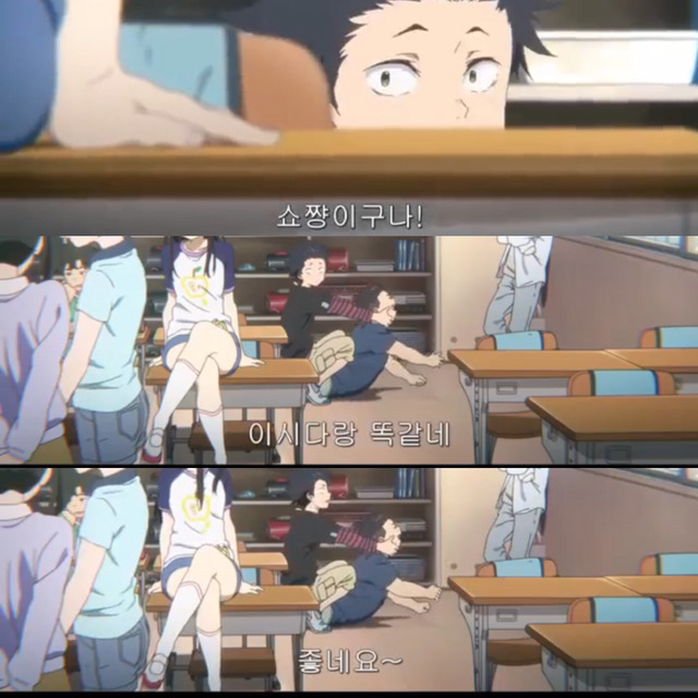 그런 우에노를 보고 다음 읽기 차례에 이시다는 쇼코의 발음을 흉내내며 조롱함 하지만 담임은 장난치지말라며 가볍게 남어감(ㅆㅂ