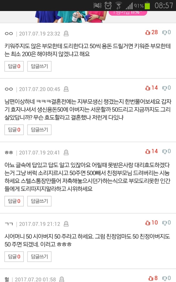 [판&톡]시부모님 용돈드리기 싫어요. 작성자세르지|작성시간17.07.20|조회수6,732 목록 댓글 18 글자크기 작게가 글자크기 크게가 http://m.pann.nate.com/talk/337985169?currMenu=talker&order=RAN&rankingType=total&page=5 다음검색 현재 게시글 추가 기능 열기 북마크 공유하기 신고 센터로 신고 댓글 댓글 18 댓글쓰기 답글쓰기 댓글 리스트 작성자찡찡아놀자 | 작성시간 17.07.20 하..ㅋㅋㅋ 작성자쑥갓숙 | 작성시간 17.07.20 남편 진짜 호구같다 작성자갓바비찬양해 | 작성시간 17.07.20 좆뱀새끼가 갑자기 효자되고 지랄이네용~~ 그전에 분명히 여자가 말했는데 이제와서 챙기라마라야~~~ 작성자촉촉한초코침 | 작성시간 17.07.20 대리효도 좆같다 작성자히알룩스 | 작성시간 17.07.20 이씨발 남쳔새끼 존나이기적 댓글 전체보기