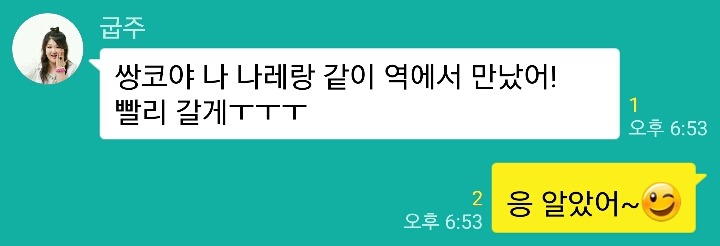 "연락해봤는데 좀 늦을것같대 우리가 더 일찍 와서 진짜 다행이야>_<"