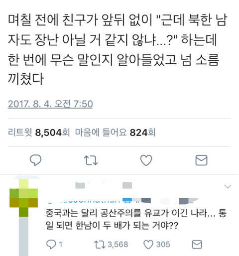 작성자SM Entertainment 작성시간 17.08.05 와 뭐야..네이버 베도에 탈북하신 분이 그린 거엔 그래도 저런 느낌까진 아니었는데 어우 한남은 그냥 다 답없는건가