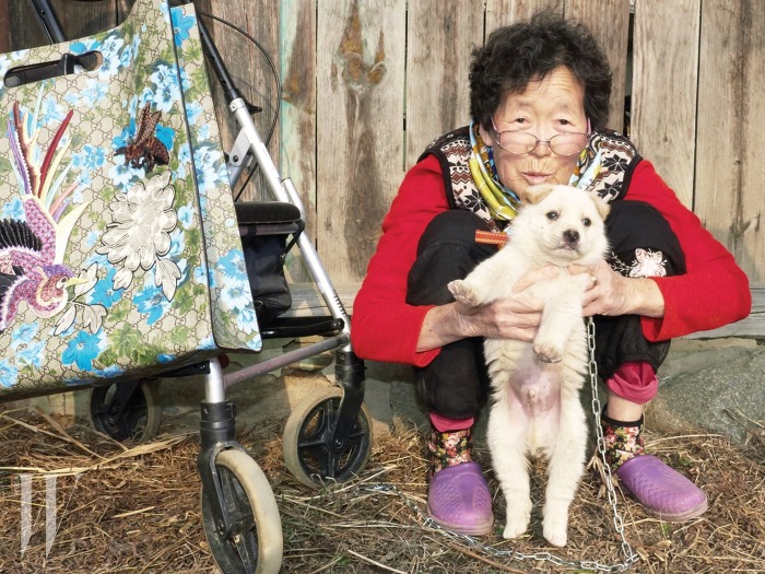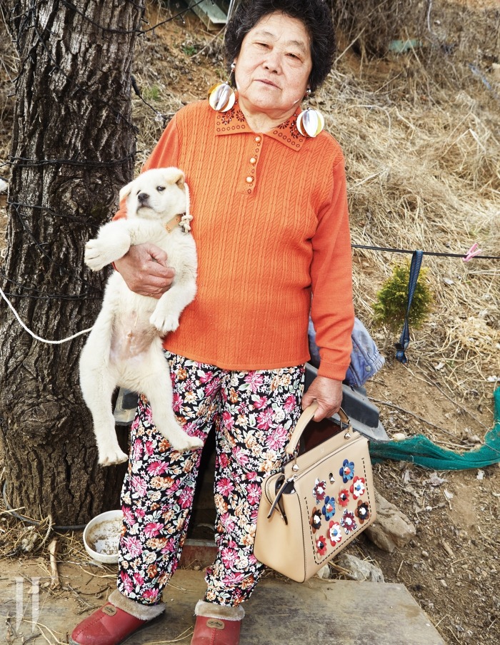 조수복 할머니가 착용한 모빌 형태의 메탈릭한이어링은 p r a d a ,화려한 가죽꽃 아플리케 장식의 갈색 닷컴 백은 Fe n d i 제품.