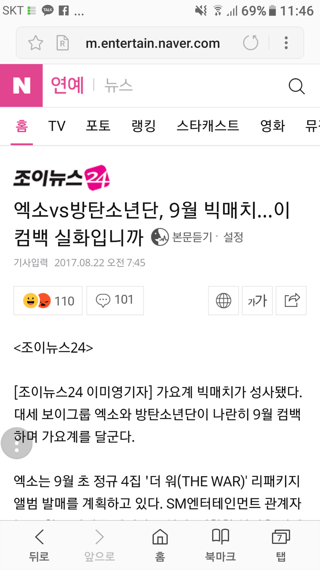 [연뉴]엑소vs방탄소년단, 9월 빅매치…이 컴백 실화입니까 작성자여름아사라져주라너무덥잖아요|작성시간17.08.22|조회수4,327 목록 댓글 239 글자크기 작게가 글자크기 크게가 http://m.entertain.naver.com/read?oid=111&aid=0000494991 다음검색 현재 게시글 추가 기능 열기 북마크 공유하기 신고 센터로 신고 댓글 댓글 239 댓글쓰기 답글쓰기 댓글 리스트 작성자빅히트 연키민 | 작성시간 17.08.22 친목해주라 콜라보,,, 방탄이 추는 몬스터랑 엑소가 추는 피땀,,, 답댓글 작성자부자된다 | 작성시간 17.09.01 ㅁㅊ오진다 작성자김용국(22) | 작성시간 17.08.22 친목 제대로 하겜ㅅ네 ㅎ 기대한다 작성자1993.01.12 | 작성시간 17.08.22 엑소 화띵❤️ 작성자EXO KAI | 작성시간 17.08.22 응 에리♥️아미 엑소♥️방탄친목각대결구도 뒤진다 댓글 전체보기