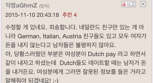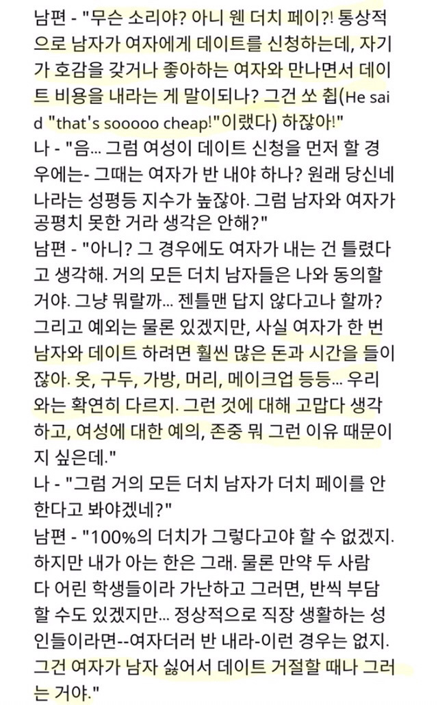 'Dutch들도 데이트할때 남자가 돈을 내거든요, 여성분께 그러면 잘못된 정보를 들은 거라고 말해줘야 되겠네요