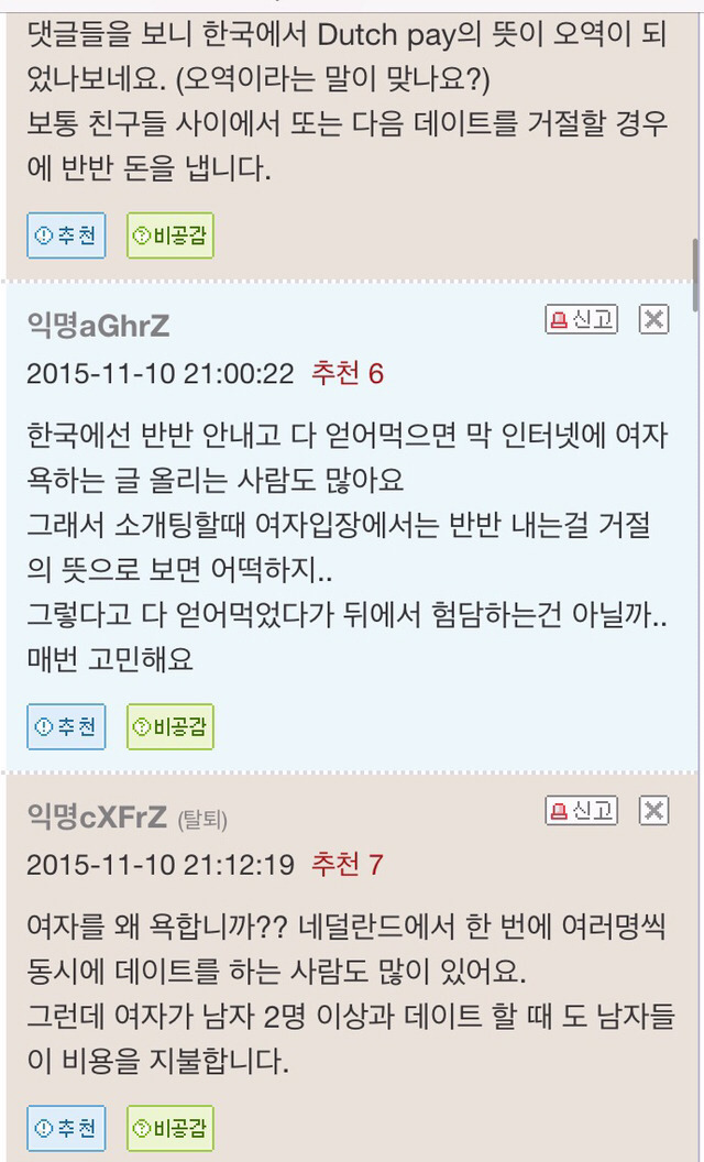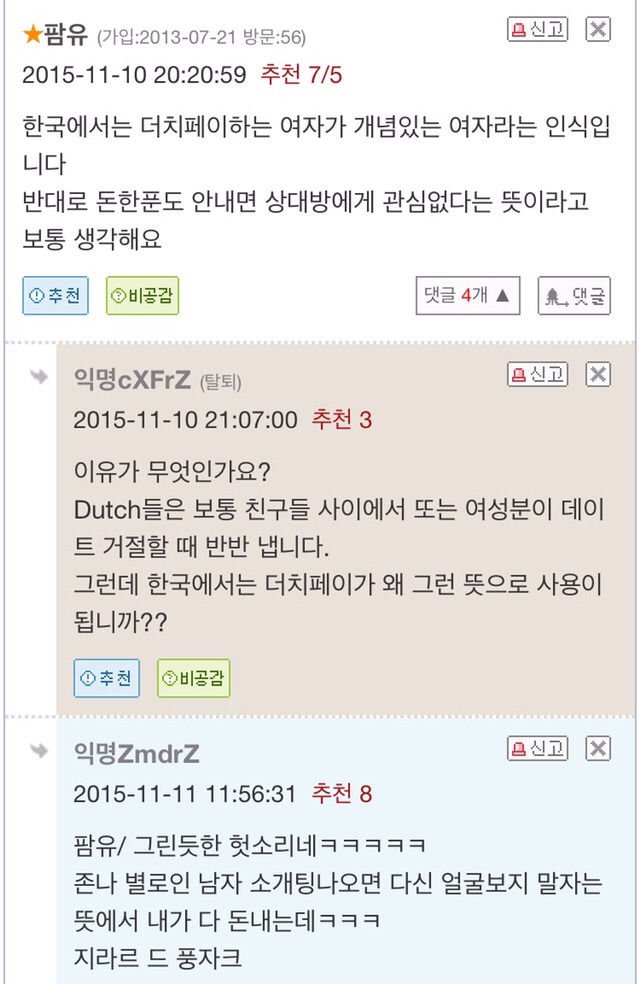 본인이 원하면 '한남페이,코리안 페이'라고 쓰는게 맞음 더치페이는 오히려 네덜란드인들은 모욕하는말ㅇㅇ