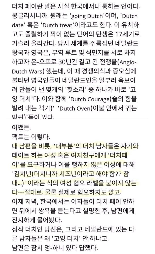 네덜란드남자(물론 유럽남들도)데이트시에 '더치페이'안하는데 왜 한국인 굳이 저 단어를 쓸까 고찰해봄