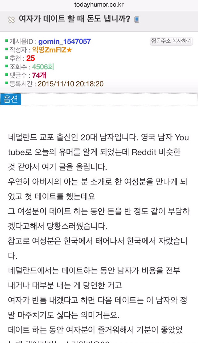 여자가 데이트비용내는건 네덜란드 및 유럽포함 거절의 의미라함.