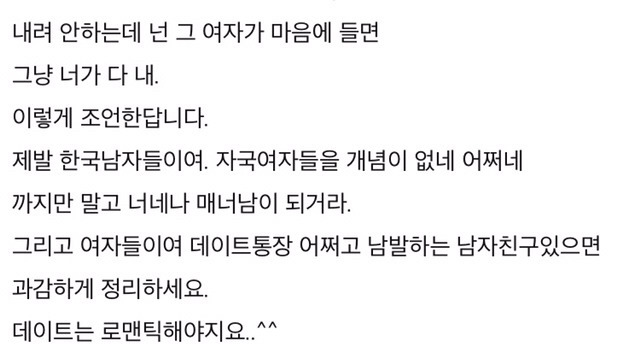 3. 글의 목적 - 코리안페이 한다고 욕하는거x , 남자가 더 내든 다 내든 김치녀 무개념녀 소리 들을 필요 없고 무서워할 필요도 없다는거 ㅇㅇ 그리고 코리안페이 강요하는 남자 만날 필요 없다는거!