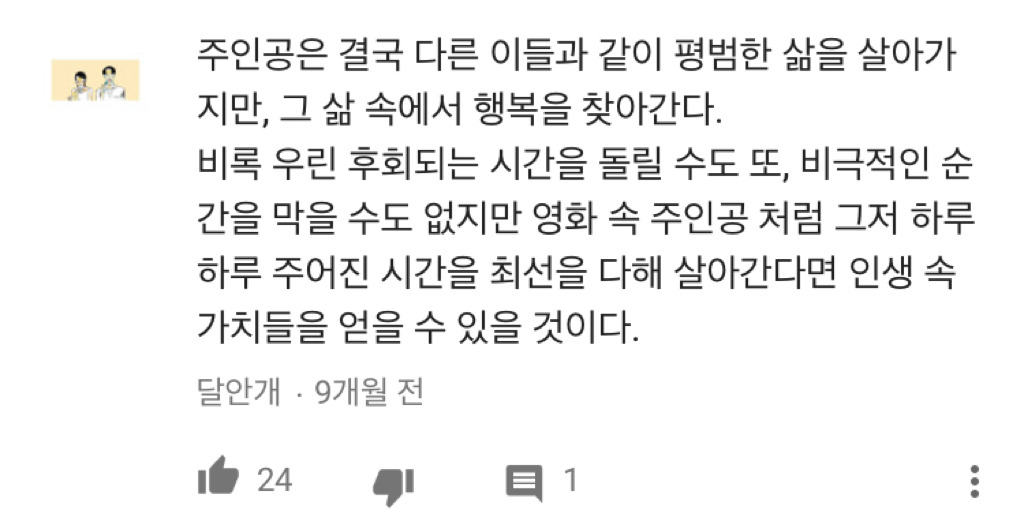 [영상]많은 생각을 들게 하는 어바웃타임 엔딩 장면 작성자Zara|작성시간17.08.31|조회수22,938 목록 댓글 15 글자크기 작게가 글자크기 크게가 동영상[영화 명장면] 매 순간순간의 소중함을 깨우치는 작품이죠. 우리가 할 수 있는 최선은 이 멋진 여행을 즐기는 것뿐입니다.www.youtube.com 문제시 어바웃타임 보러 감 다음검색 현재 게시글 추가 기능 열기 북마크 공유하기 신고 센터로 신고 댓글 댓글 15 댓글쓰기 답글쓰기 댓글 리스트 작성자오케오케~!! | 작성시간 17.08.31 진짜 내 인생영화 ㅡㅜㅠㅠㅠㅠㅠㅠ.... 영상미 스토리 창의성 다 넘모 좋음ㅠㅠㅠㅠㅠ 뻔한 얘기 뻔한 교훈인데도 너무 잘 담아냄ㅠㅠ 작성자옴흐라힛흐 | 작성시간 17.08.31 으아 너무 좋아 ㅠㅠ 작성자김다니 | 작성시간 17.08.31 보ㅓ야겠다 작성자수호 EXO | 작성시간 17.09.01 내 인생영화ㅠㅠ 작성자또회사가야해돈벌러 | 작성시간 17.09.01 최애영화ㅠㅠㅠㅠ 댓글 전체보기