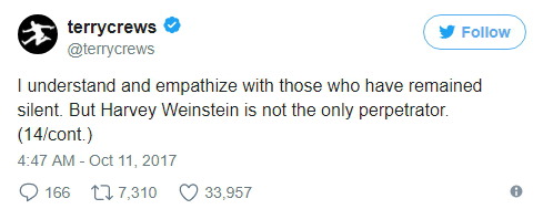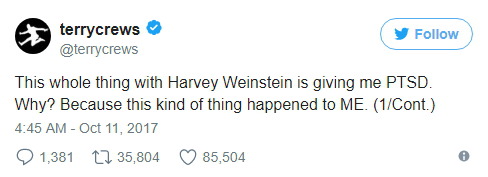 할리우드 거물로부터 성추행을 당한 건 여성 배우들뿐만이 아니었다. 영화 '화이트 칙스'와 '익스펜더블' 등에 출연한 배우 테리 크루즈 역시 성추행 피해 사실을 고백하며 웨인스타인의 성추행 전적을 폭로한 여성들을 응원했다.