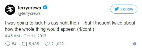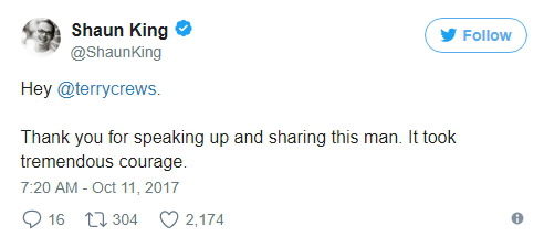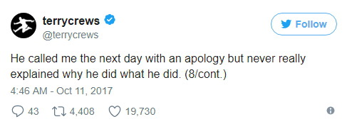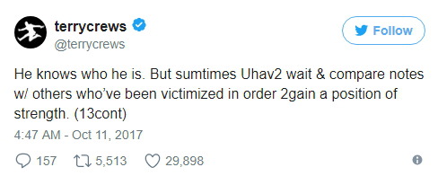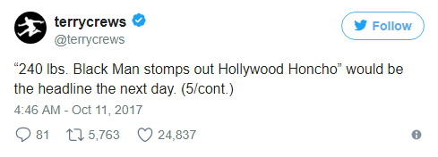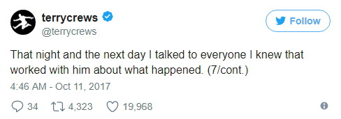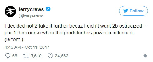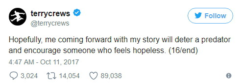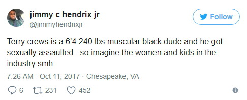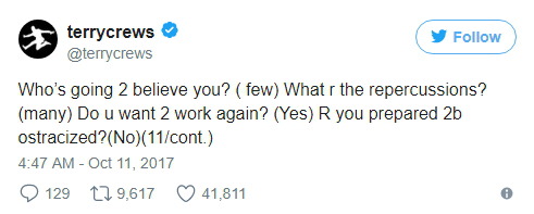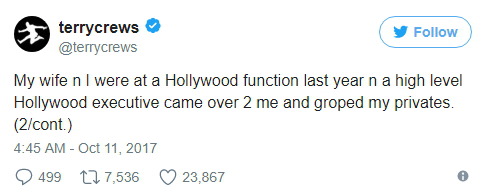 테리 크루즈는 키 193cm, 몸무게 108kg인 근육질의 흑인 남성인데 성추행당했다. 그러니 영화 업계에서 일하는 여성과 아이들이 어떤 대우를 받을 지 상상해보시라.