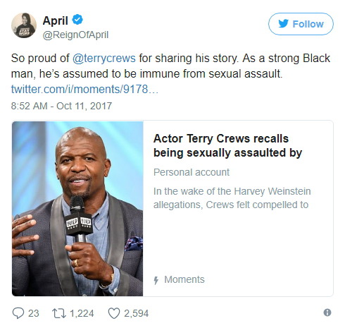 자신의 이야기를 공개한 테리 크루즈가 정말 자랑스럽다. 사람들은 그가 건장한 흑인 남성이기 때문에 성폭력으로부터 무사할 거라 치부한다.