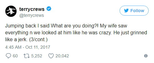 나는 뒤로 펄쩍 뛰며 '뭐 하는 거냐'고 외쳤다. 아내도 이 상황을 모두 목격했고, 우리는 그 남자를 미친 사람 보는 듯 쳐다봤다. 그는 그저 얼간이처럼 미소지을 뿐이었다.