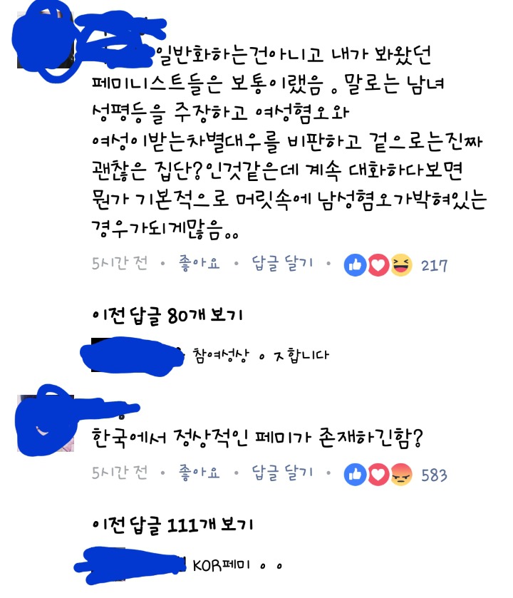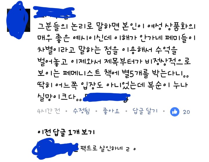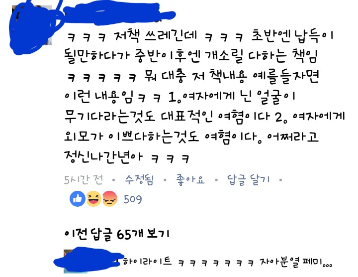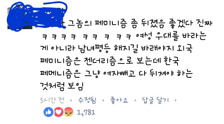 단순 인기BJ기 때문이 아니라 페미의 ㅍ자도 모르는애들이 저런식으로 댓글싸지르며 페미 매도하고 억누르려는게 너무 훤히 보이지않아?? 진짜 페미확산을 위해선 페북 버리고가자는 말을 못하겠다.. 페북이야말로한남, 여자마초 천지임.. 저기댓글만해도 남녀 성비율 비슷해.. 여성BJ가 페북책하나 읽어서 저지랄들인데 화력지원부탁할게~